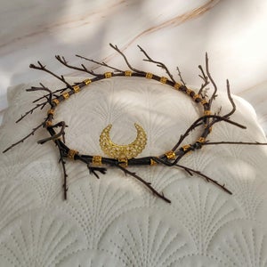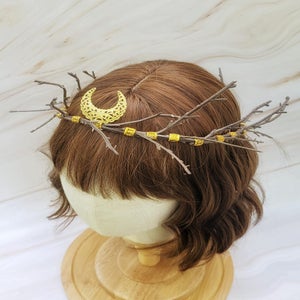 "Inspired by the Greek goddess Artemis this hair garland features faux twigs bound together with gold tone filigree. A gold filigree moon is attached to the center front of the crown."