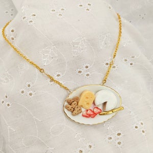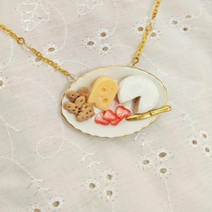 Hand crafted tiny cheese plate featuring a wedge of Swiss cheese, round of brie, strawberry slices, heart shape crackers, and a gold knife.
