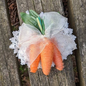 "Three twine wrapped garden carrots nestled in a rosette of cream lace. A dainty cream organza bow is the finishing touch to this darling corsage.