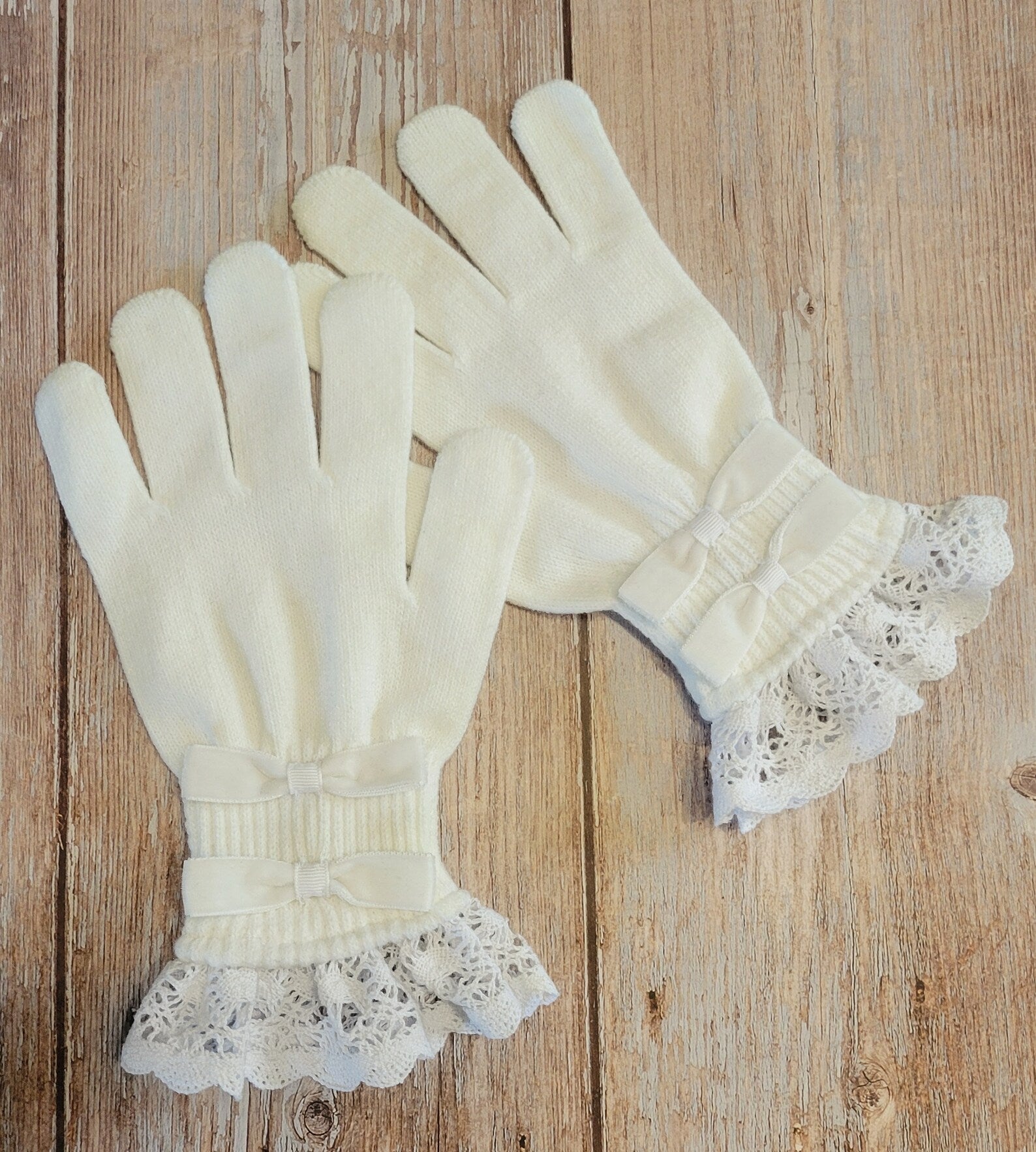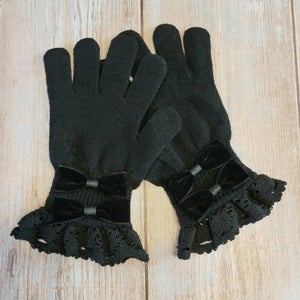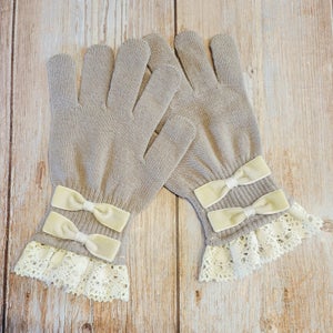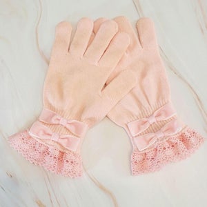 "These warm knit gloves are adorned with matching lace and velvet bows. Protect yourself from cold weather and be cute as well! Pick from black, pink, white, or milk tea colorways."