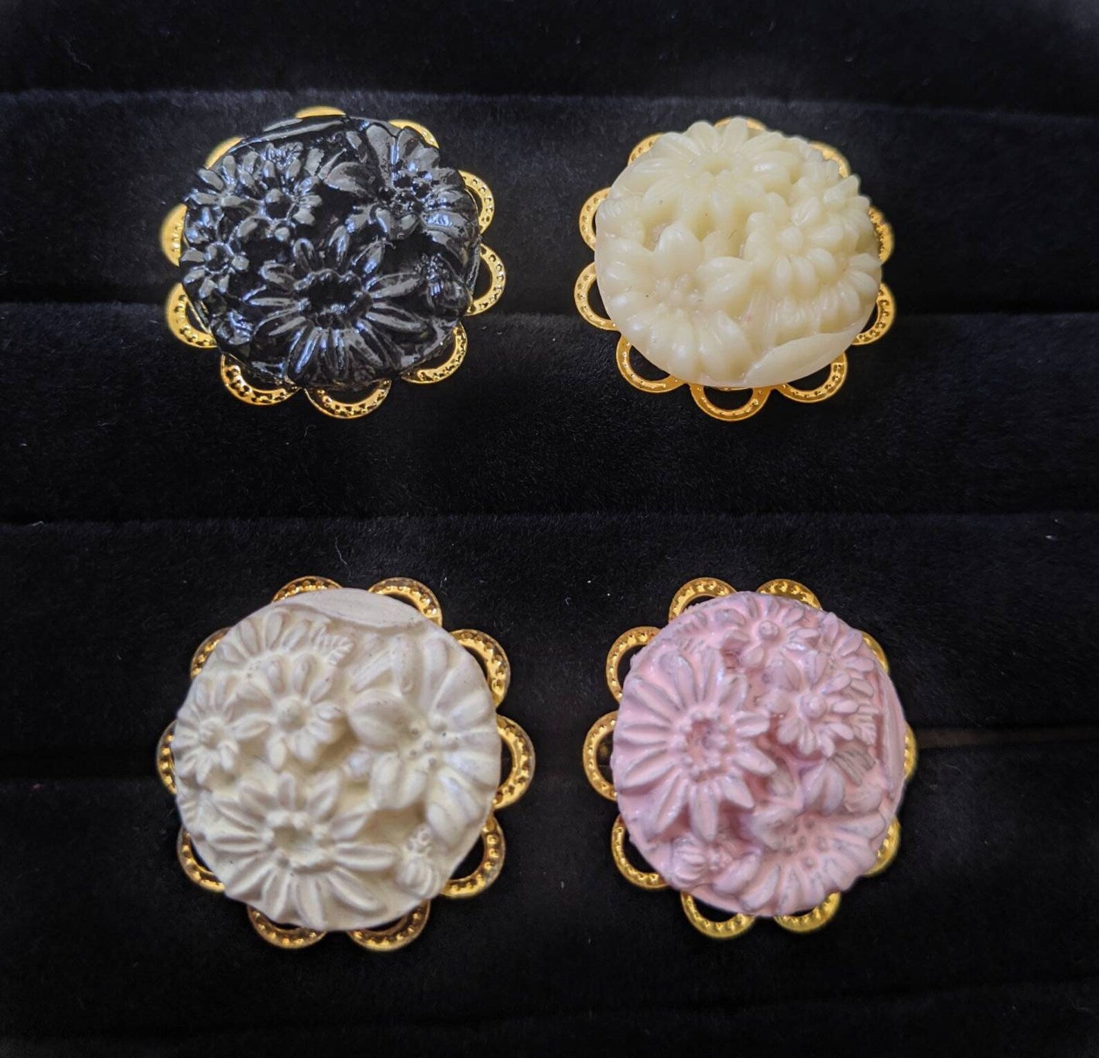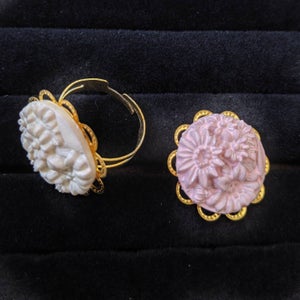 "Delicate and lovely, this adjustable ring features a darling floral acrylic cameo on a gold tone filigree setting."