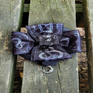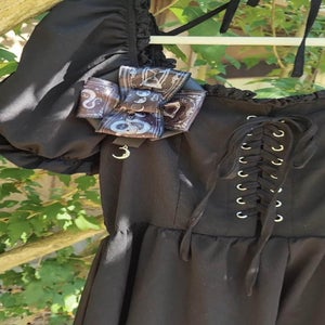"Bewitching rosette made with black ribbon illustrated with mystical symbols and matching black grosgrain ribbon. Finished with a silver tone moon charm.