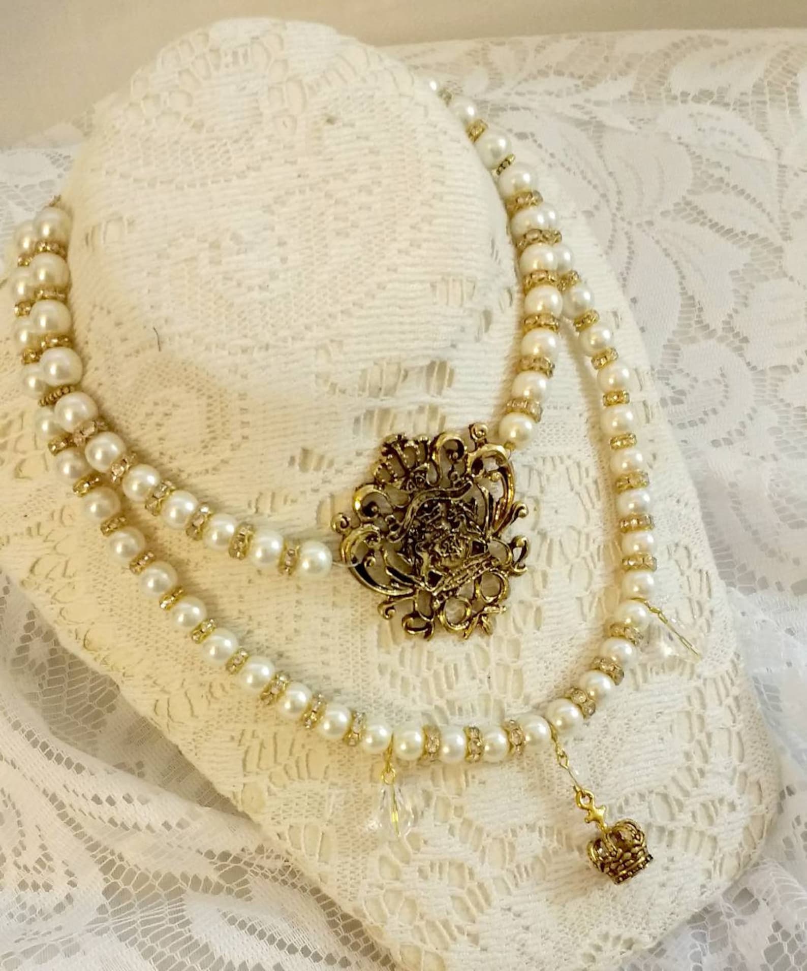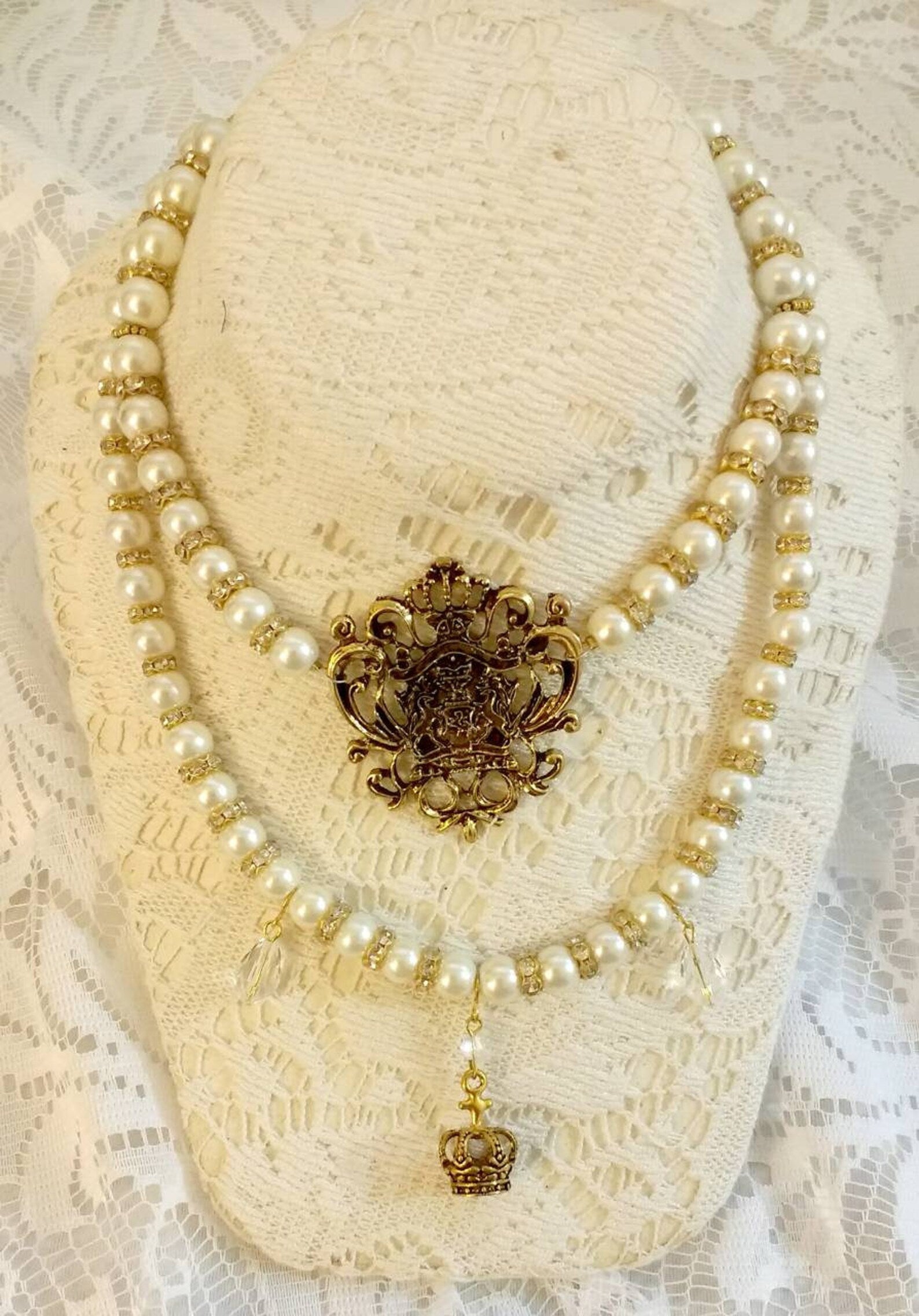 "This elegant necklace features a large gold tone royal crest pendant accented with ivory glass pearls interspaced with gold tone and rhinestone spacer beads. Highlighting are crystal drops and a gold tone crown charm.