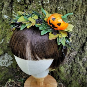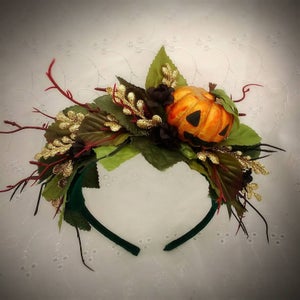 "This headdress features a cheerful and spooky Jack-O-Lantern accented with faux black flowers, creepy twigs, and dark green leaves. Headband is covered with matching dark green ribbon.