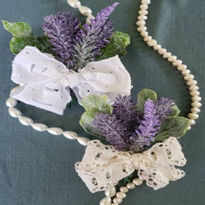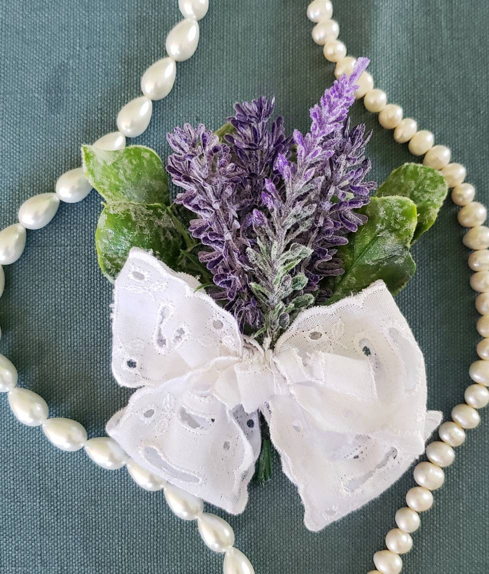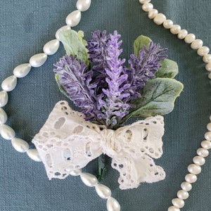 "Lovely faux lavender flowers gathered into a dainty corsage with a bow of eyelet lace."