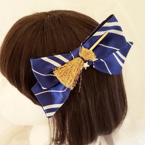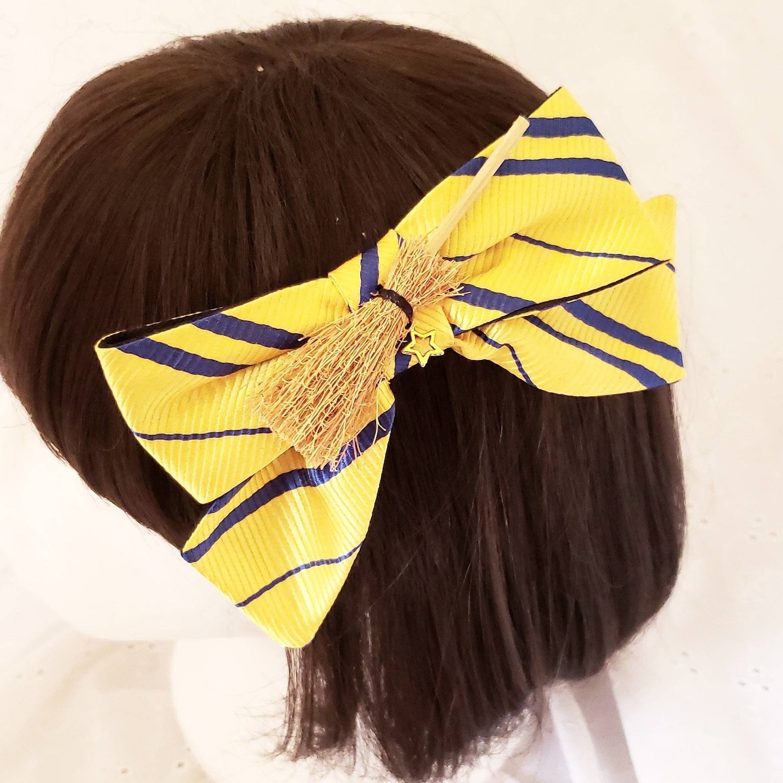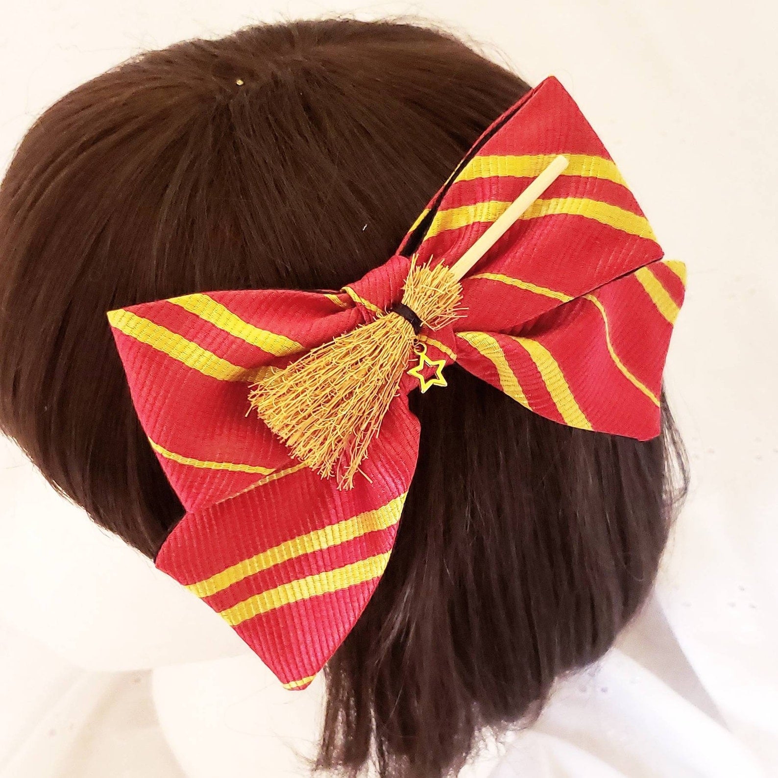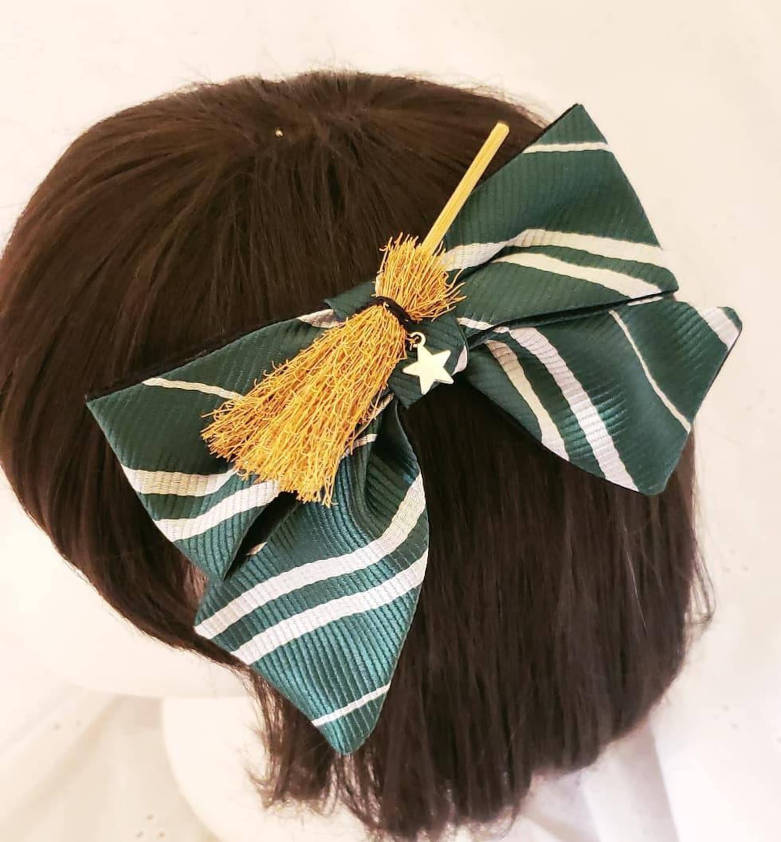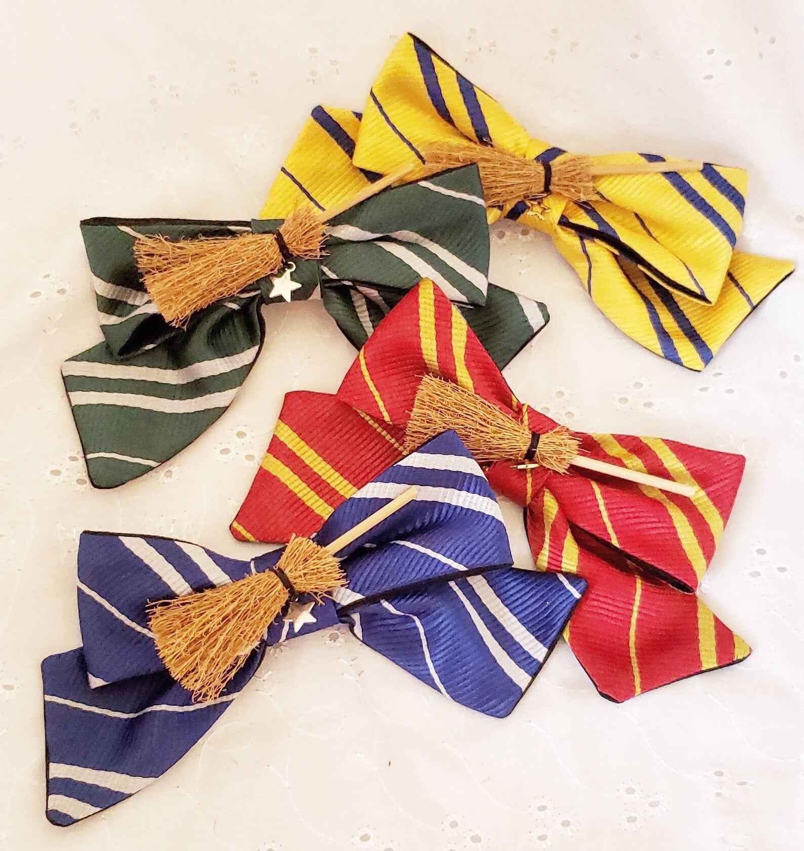 "Show your house pride at the next Quidditch match. These hair bows are made with appropriately striped fabric accented with a tiny broom and gold or silver tone star charm.