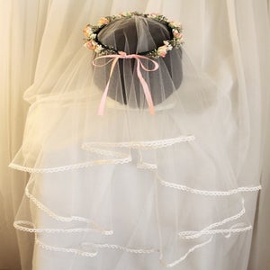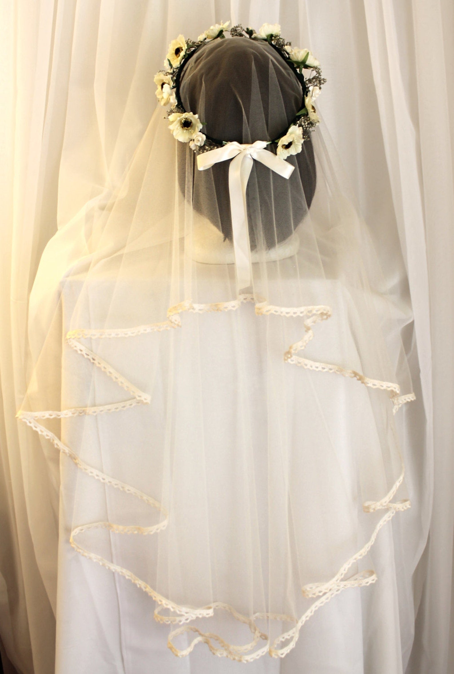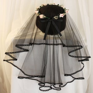 "Worn alone or paired with a lovely accessory this veil will add that final touch to your outfit. Made from soft tulle it is edged with matching cotton lace and is attached to a comb. Comes in black, white, or cream."