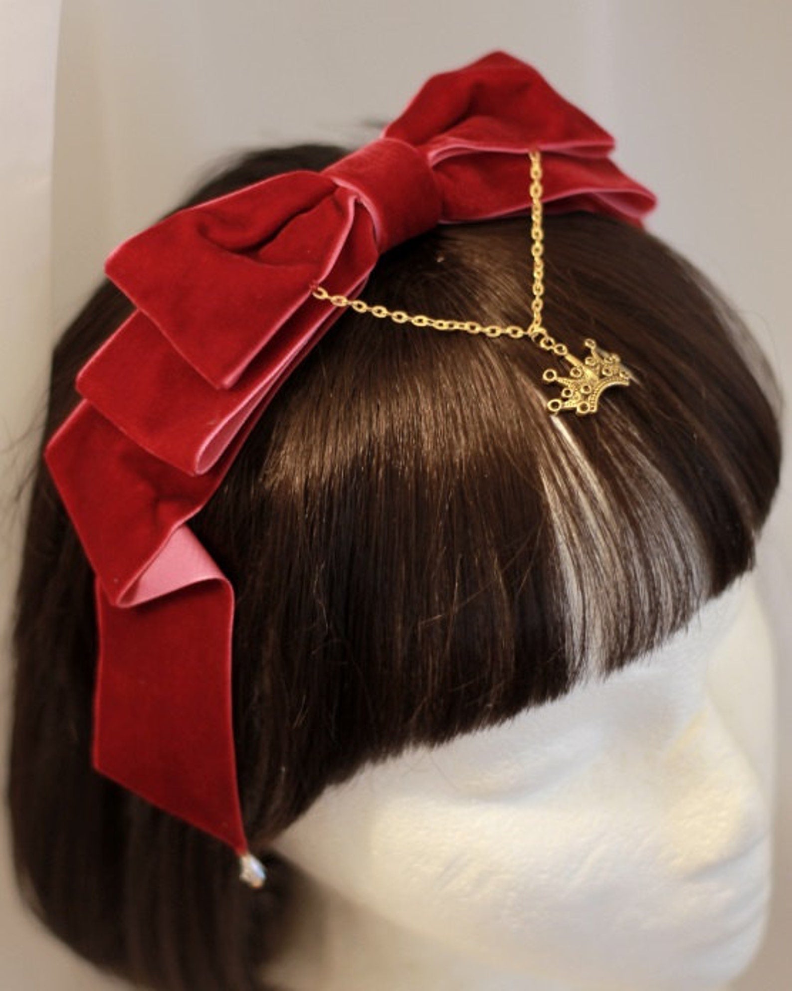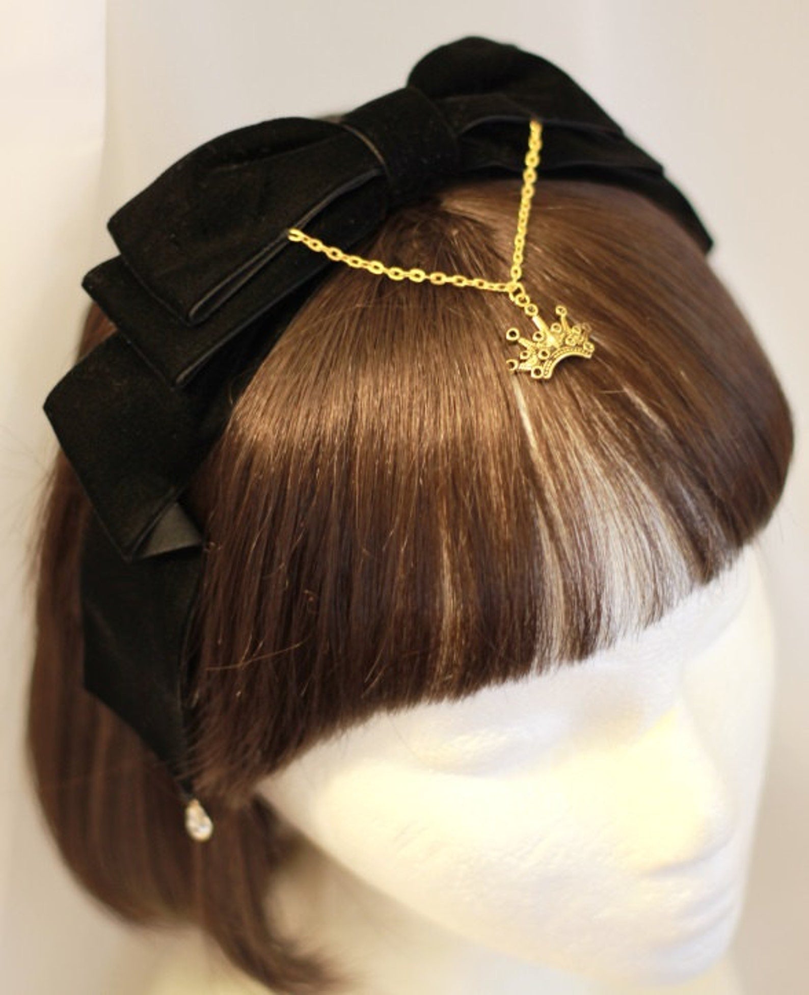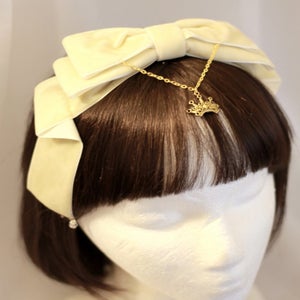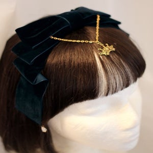 "A rich velvet bow accented with crystal beads and a gold filigree crown charm. Mounted on a matching ribbon covered headband. Comes in 4 elegant colors."