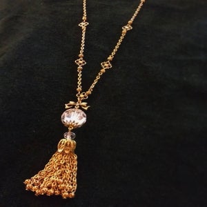 "Inspired by vintage jewelry this necklace features a large handmade gold tone chain tassel hanging from a large crystal bead. The elegant chain is broken up with gold tone filigree beads and quatrefoil charms. The necklace is 19 inches in length from the clasp to the tip of the tassel."