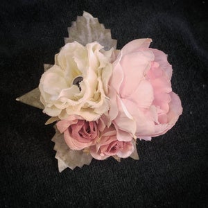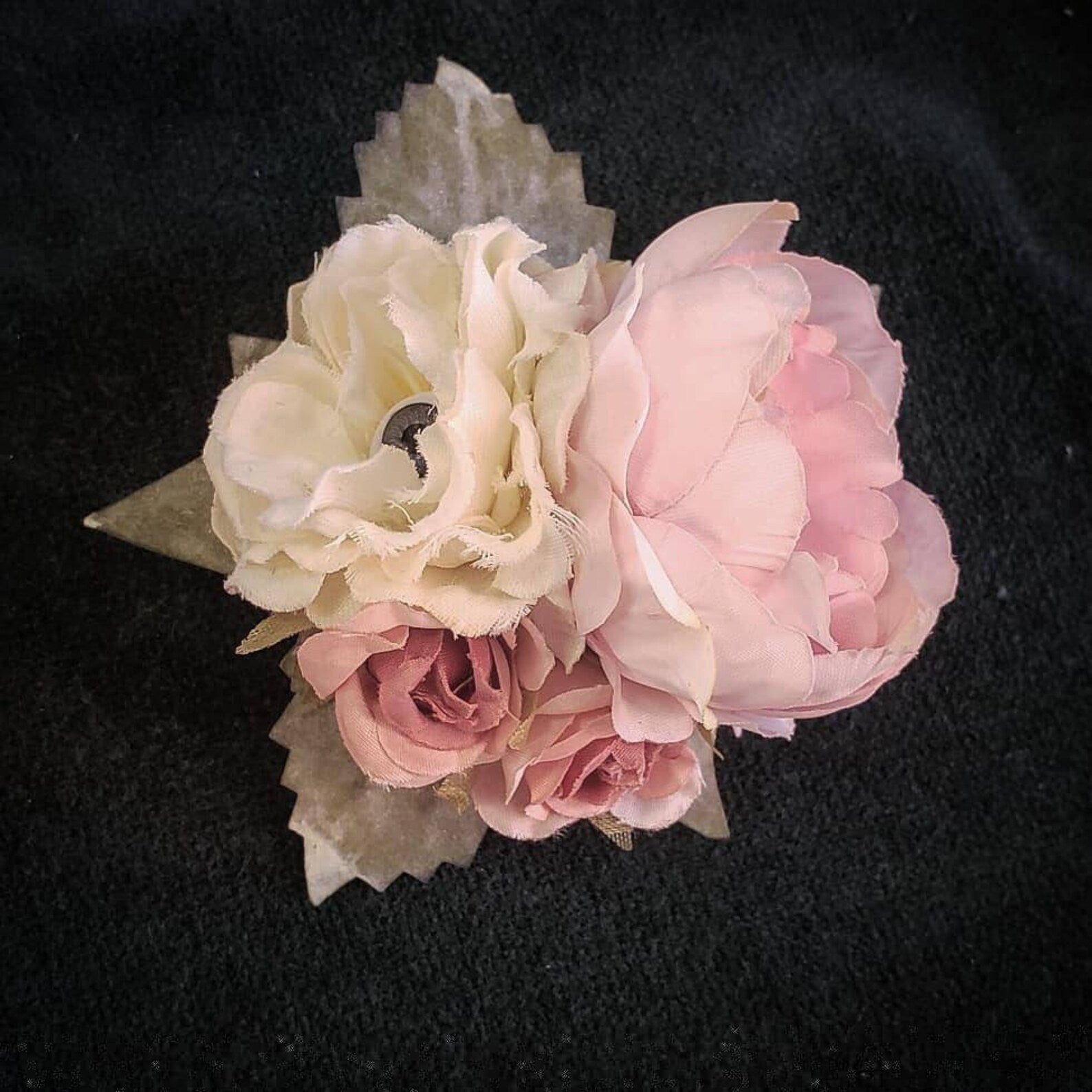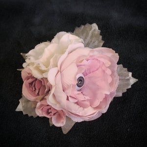 "Be careful what you pick in a witch's garden. Doll's eyes peek out from dusty rose blossoms.