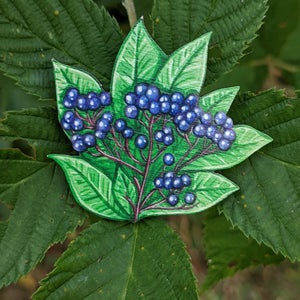 "The flowers and berries of the elder are both used to flavor beverages and food. The tiny useful berries featured on this brooch are digitally printed on birchwood.