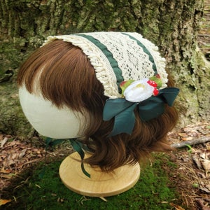 "Rectangle headdress accented with cream cotton crochet style lace, dainty mushrooms, Lily of the Valley blossoms, and grosgrain bows. Ties with grosgrain ribbon.