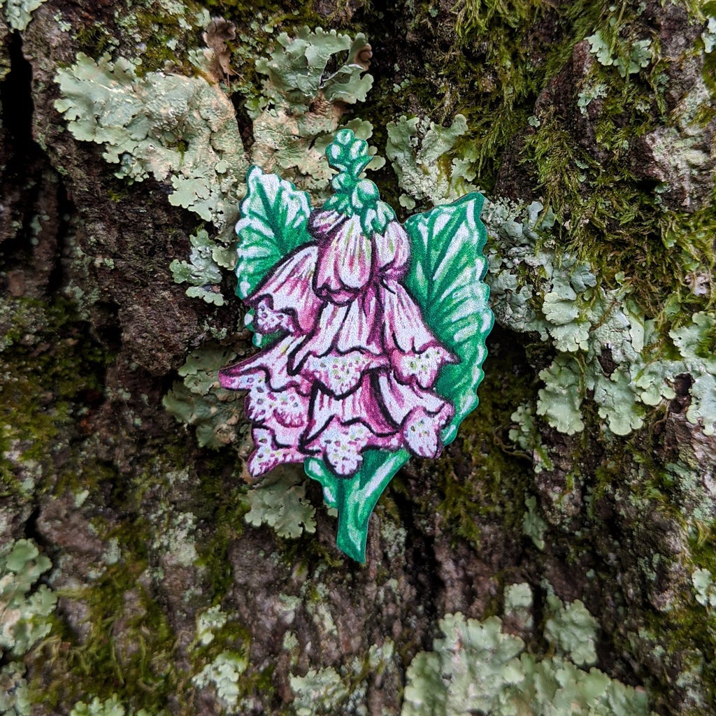 "Both medicinal and poisonous this brooch features a foxglove digitally printed on wood.