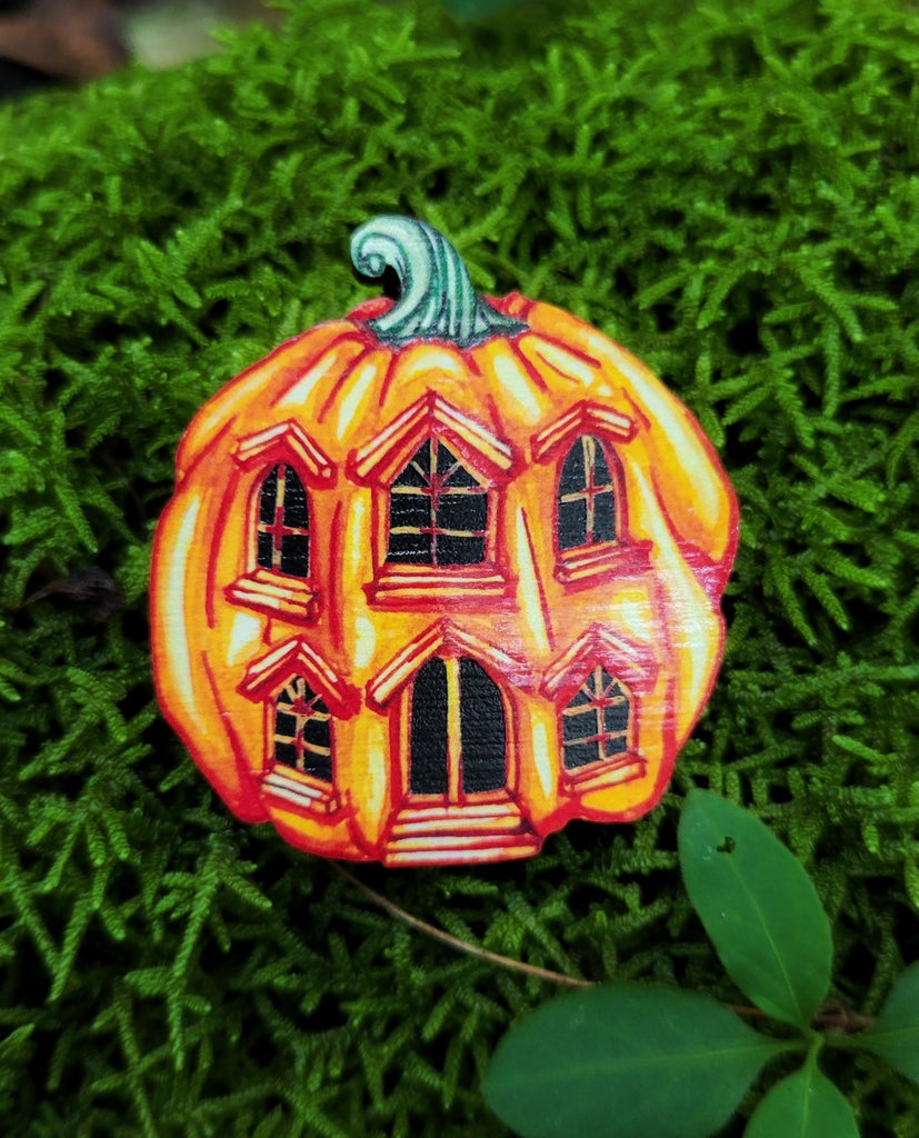 "A spooky but charming house carved from a pumpkin. Who or what fey creature lives inside? Brooch is digitally printed on wood.