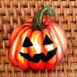 "Is it Halloween yet? This spooky but cheerful fellow certainly thinks so. This brooch features a jack-o-lantern digitally printed on wood.