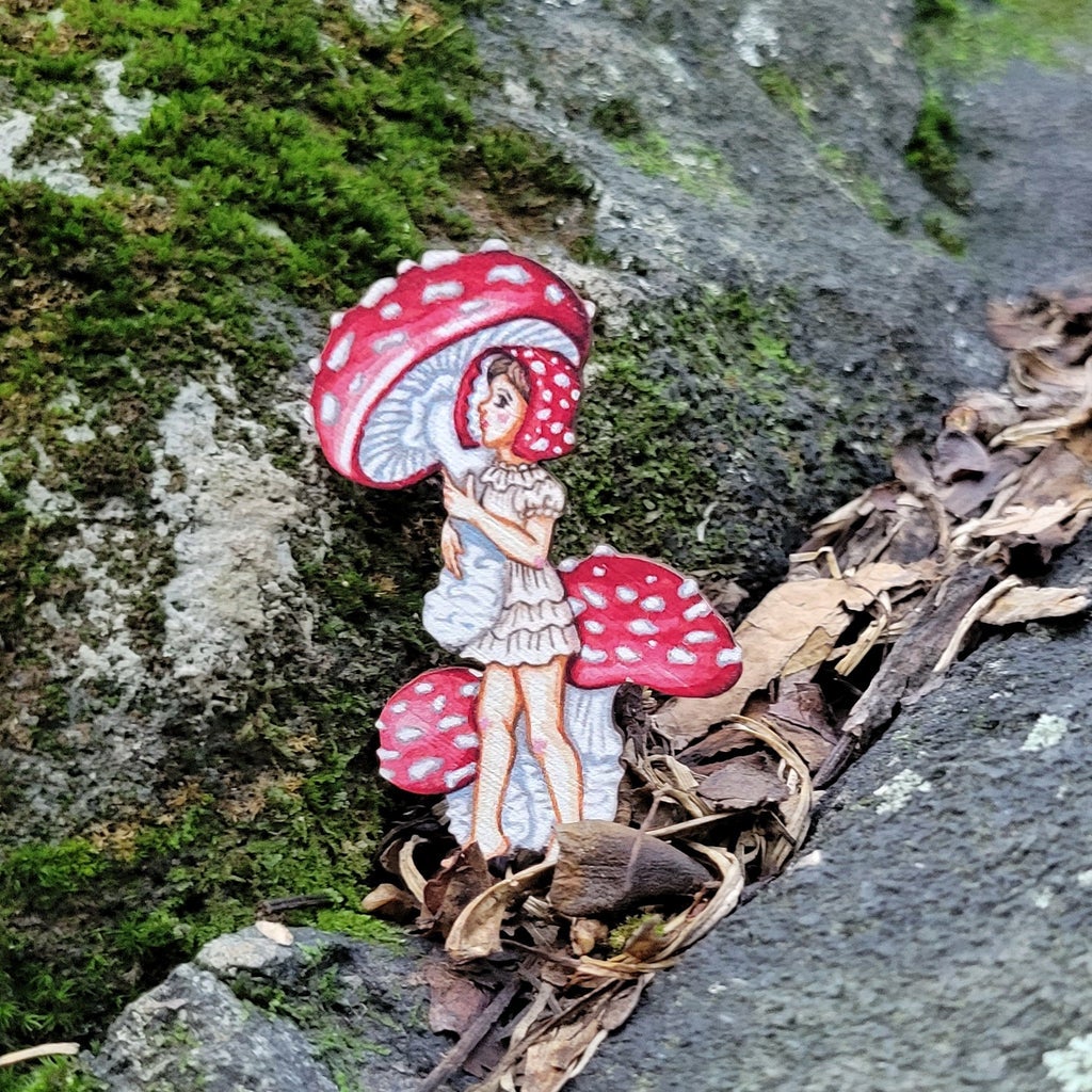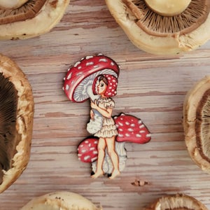 "The most recognized mushroom Amanita muscaria is a fairytale beauty with psychotropic properties as well as being toxic if not prepared correctly. Brooch is digitally printed on birchwood.