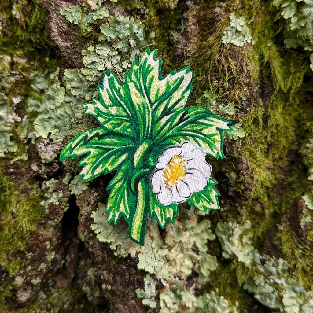 "Hiding its blossom under a charming umbrella like leaf; this brooch features a May Apple digitally printed on wood.