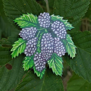 "Mulberry leaves are the favorite of the domesticated silkworm. Most people tend to prefer the fruit though. The purple variety is featured on this brooch digitally printed on birchwood.