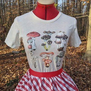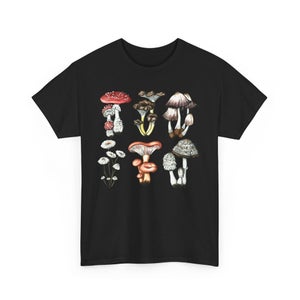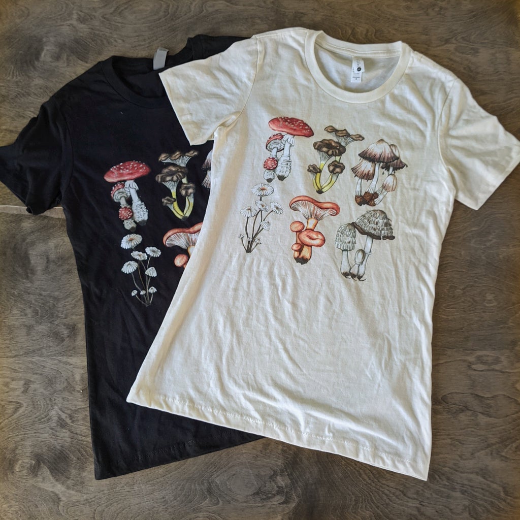"Inspired by the pages of a Victorian mycologist's notebook, this t-shirt features a variety of mushroom species. Artwork was originally hand done with watercolors.