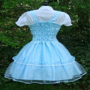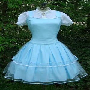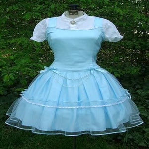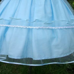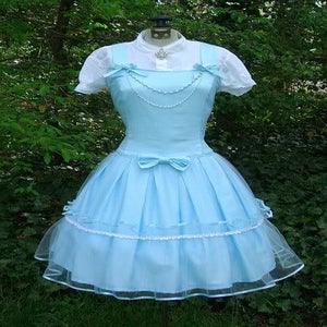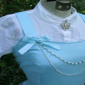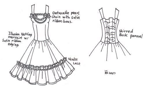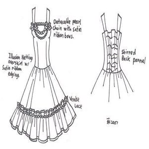 The jumperskirt will be done in a cotton sateen, with an illusion netting overskirt, trimmed with satin ribbon trim and venise lace. Please refer to the color swatches below to see what colors are available All details (lace and pearls) will be done in white. The pearl chain and bow are both detachable.