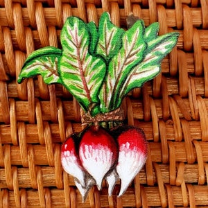 "Inspired by the harvest and farmer's market this brooch features a rustic bunch of radishes digitally printed on wood.