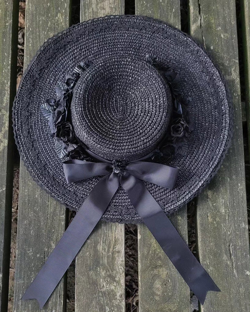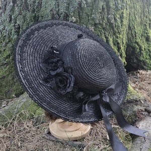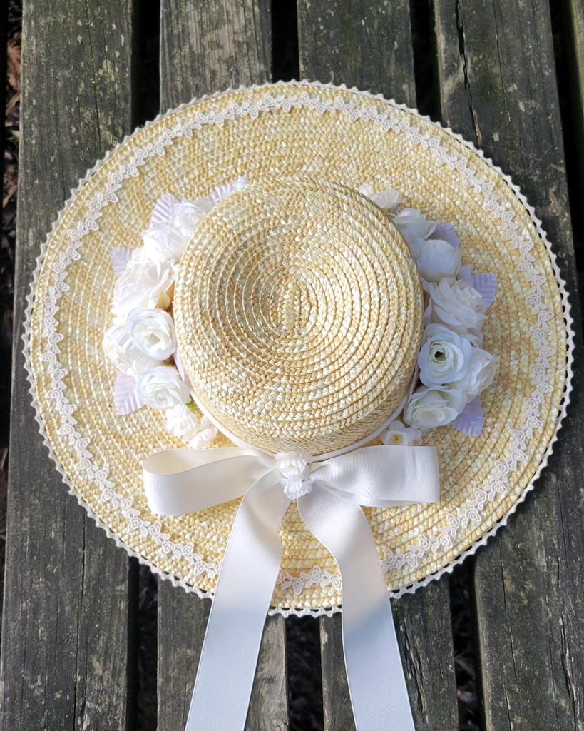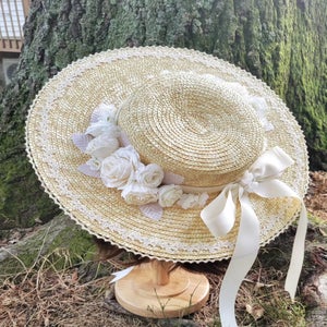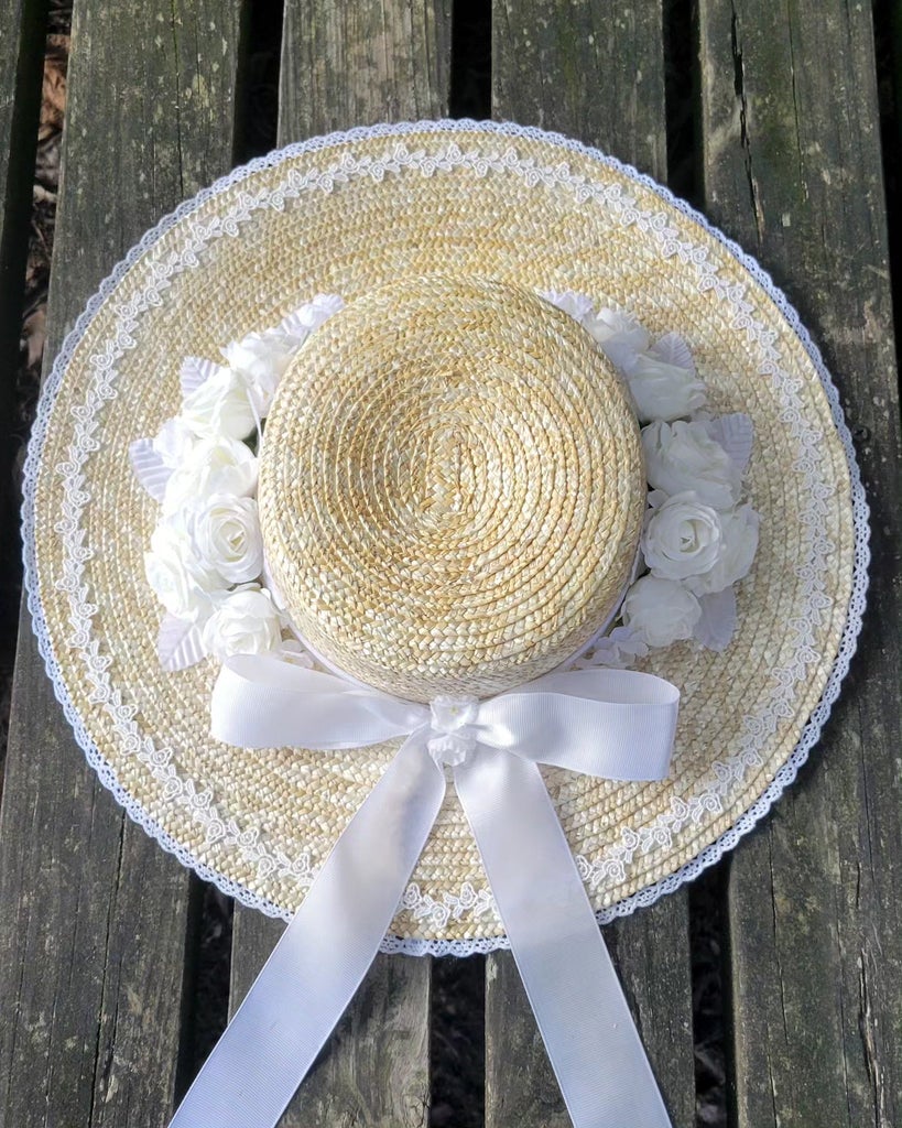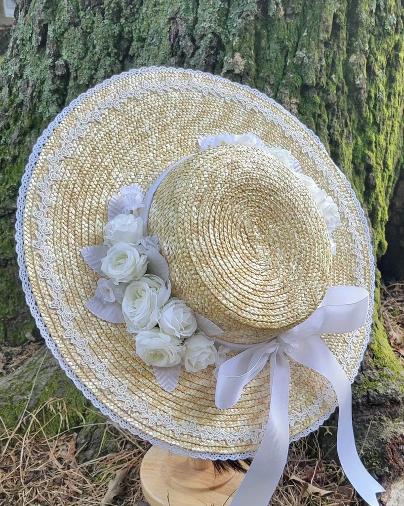 "This wide brimmed straw hat is trimmed with several layers of lace, symmetrical faux roses, flowers and leaves, and a grosgrain hatband and ribbon. The hat has matching grosgrain ribbon ties so you can wear it tied under the chin or your hair."