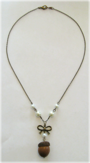 Materials: Hand finished acorn elements accented with glass pearls and vintage bronze toned findings
