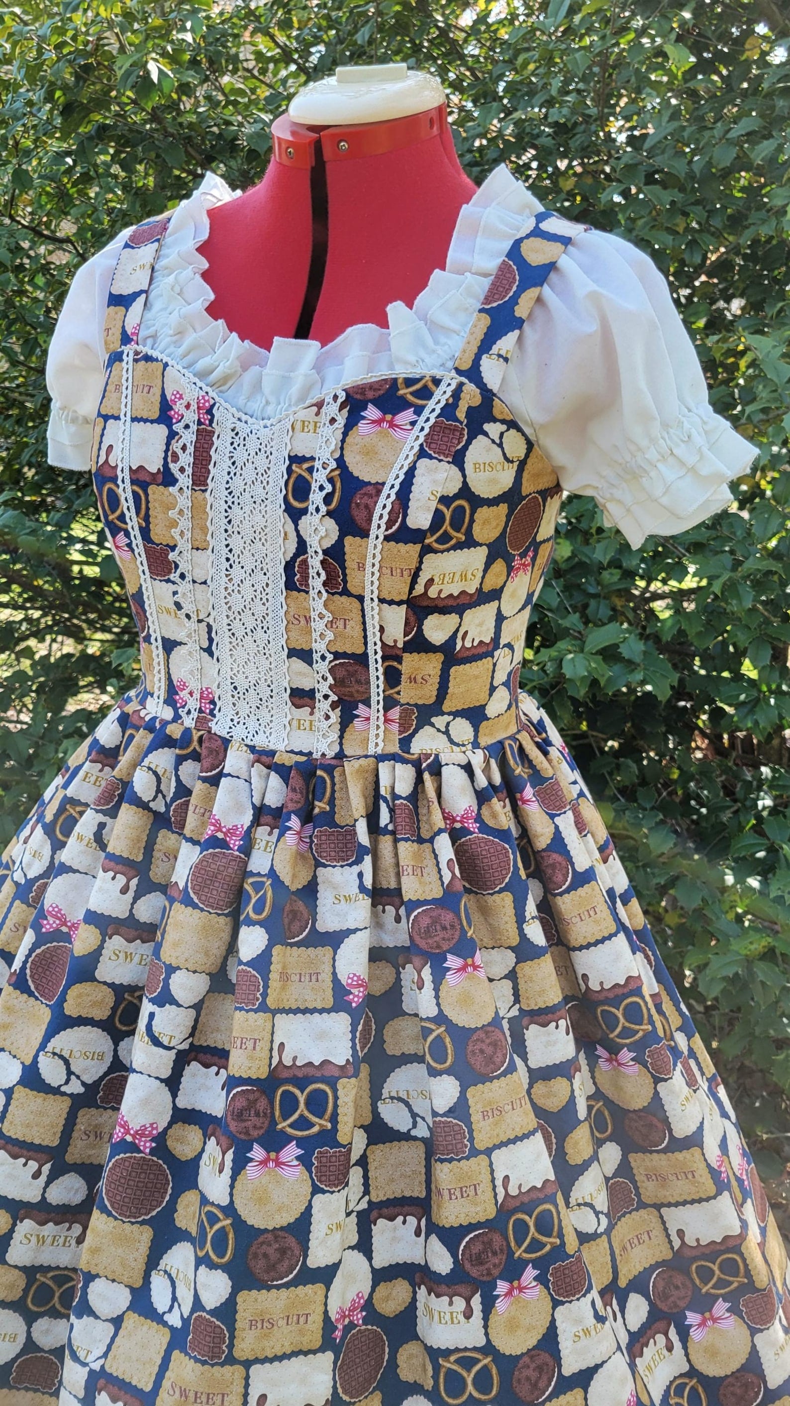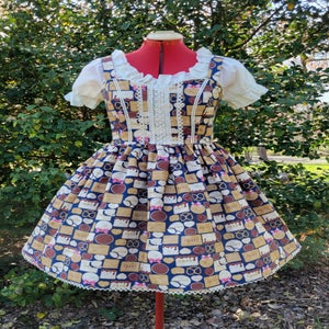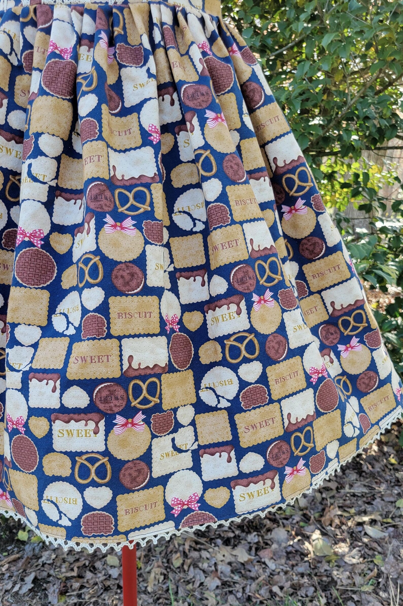 "Super cute navy sweet lolita jsk with a cute cookie and pink bow repeating print.