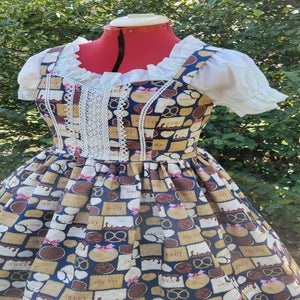 A fully lined jumperskirt with back shirring and adjustable straps. Cotton outer fabric. Bodice lined with cotton and skirt with poly. Accented with delicate cream cotton crochet style lace. Full sized pockets in both side seams."