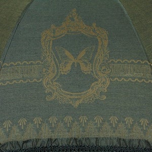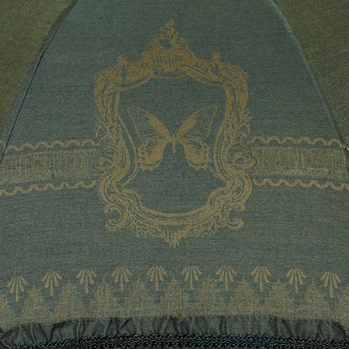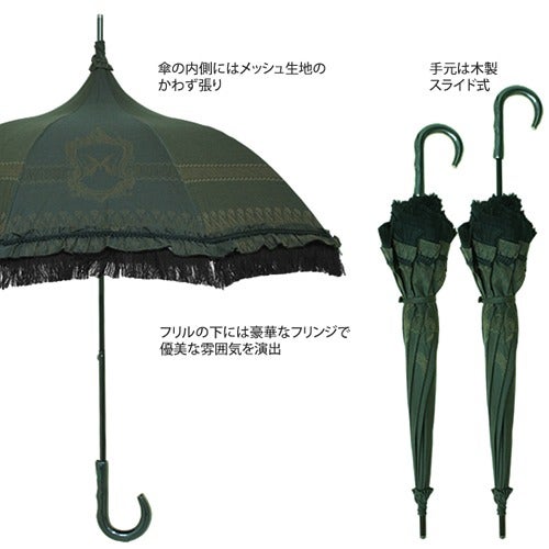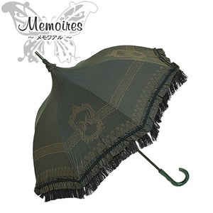 Memoires" is a short length parasol with a butterfly motif by Lumiebre. The design is based on the image of a ring, and the special fabric processing "crash processing" is applied to create a unique atmosphere due to the shimmering of the threads. The hem of the umbrella is boldly decorated with fringes to pursue the design. The inside of the umbrella is made of a mesh material called "Kawazu-bari," which gives it a lightness and a sense of quality. The brown color is rare for a parasol.