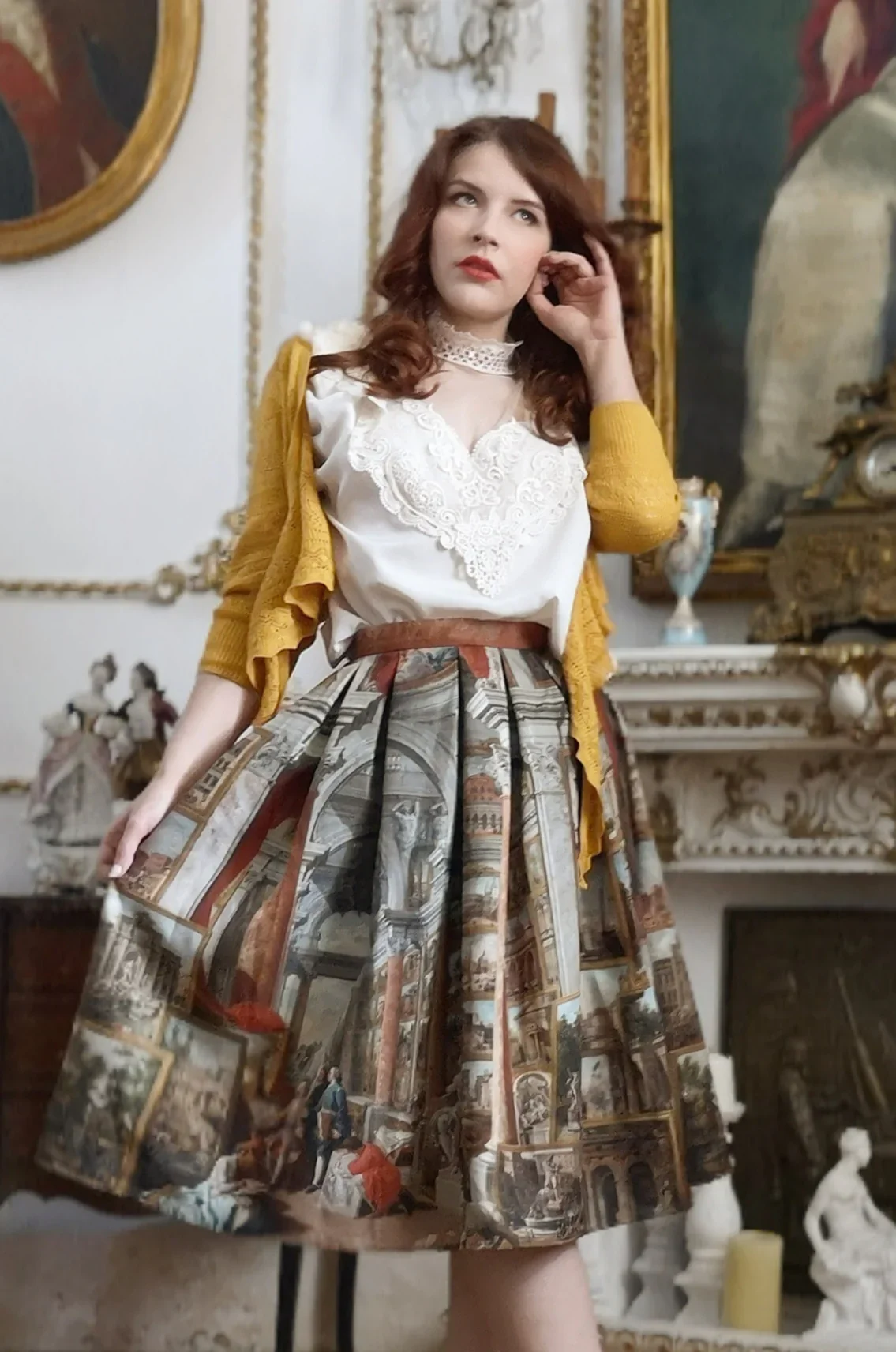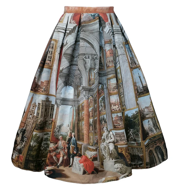- Made of high quality thick polyester to ensure durability. This piece of art skirt is perfect as a luxurious dressing-room addition with exceptionally long lasting fabric design.- Flare skirt- Thick, strong hems to ensure quality- Woven fabric enriched with Lycra just to make sure it does not crease.- Natural viscose based lining which is luxurious in touch.- Invisible side zipper- Fabric layout is unique testimony of art from the past.- All fabrics are designed and made in European Union