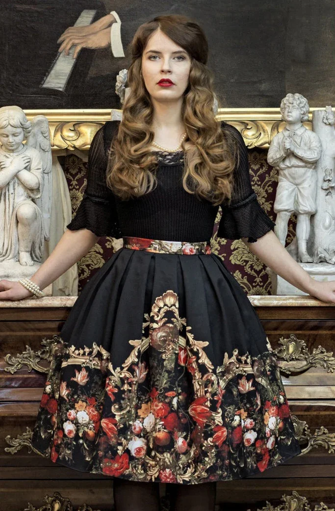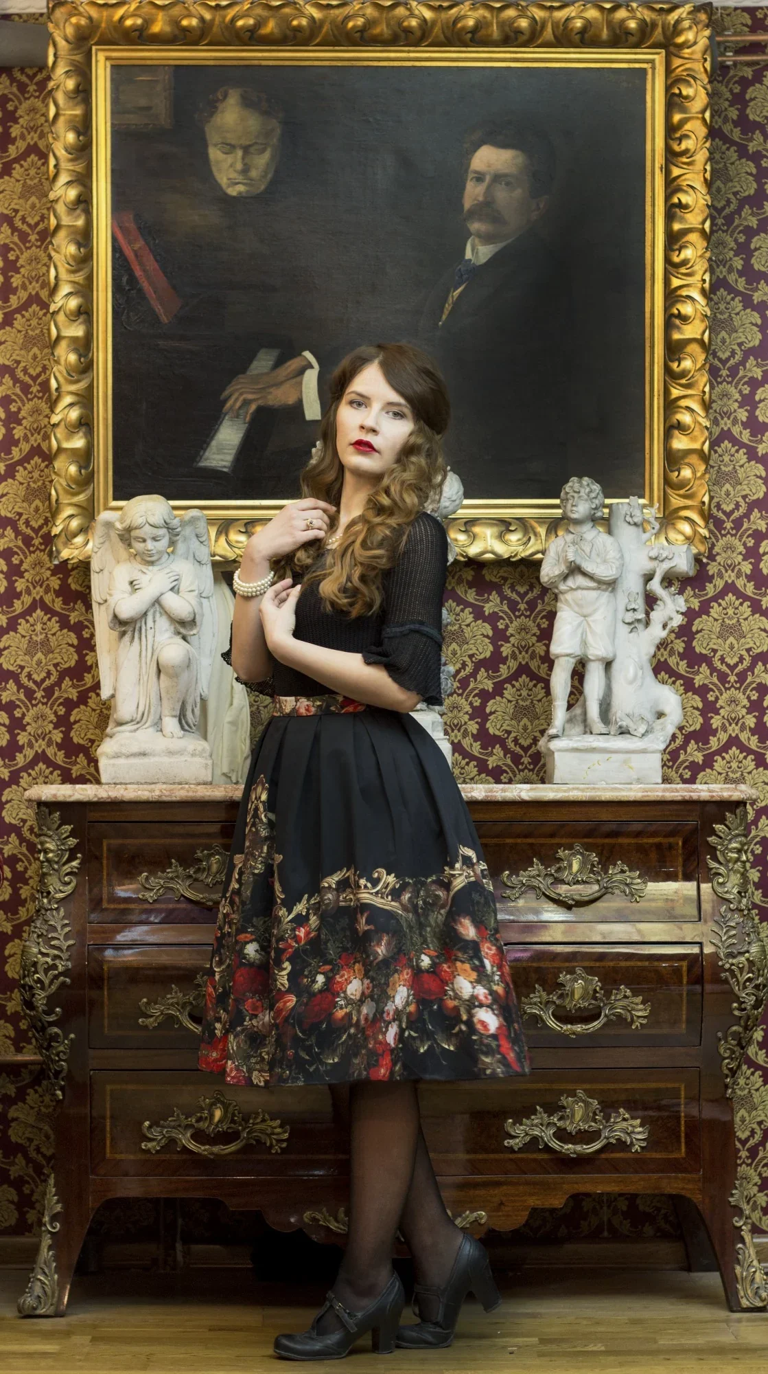 - Made of high quality thick polyester to ensure durability. This piece of art skirt is perfect as a luxurious dressing-room addition with exceptionally long lasting fabric design.-Flare skirt-Thick, strong hems to ensure quality-Woven fabric enriched with lycra just to make sure it does not crease.-Fabric layout is unique testimony of art from the past.-Natural viscose based lining which is luxurious in touch.-Invisible side zipper-All fabrics are designed and made in European Union, as well as-Please, contact if you would like different length.
