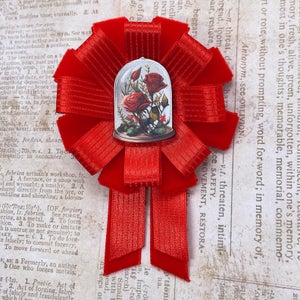 This mini rosette can be worn by yourself or your little friend (a plush bag, for example) and features a lasercut wooden image of a cloche jar with roses, backed with lace and surrounded by tiers of red ribbons. The rosette measures approximately 3 inches wide and 4.5 inches tall.