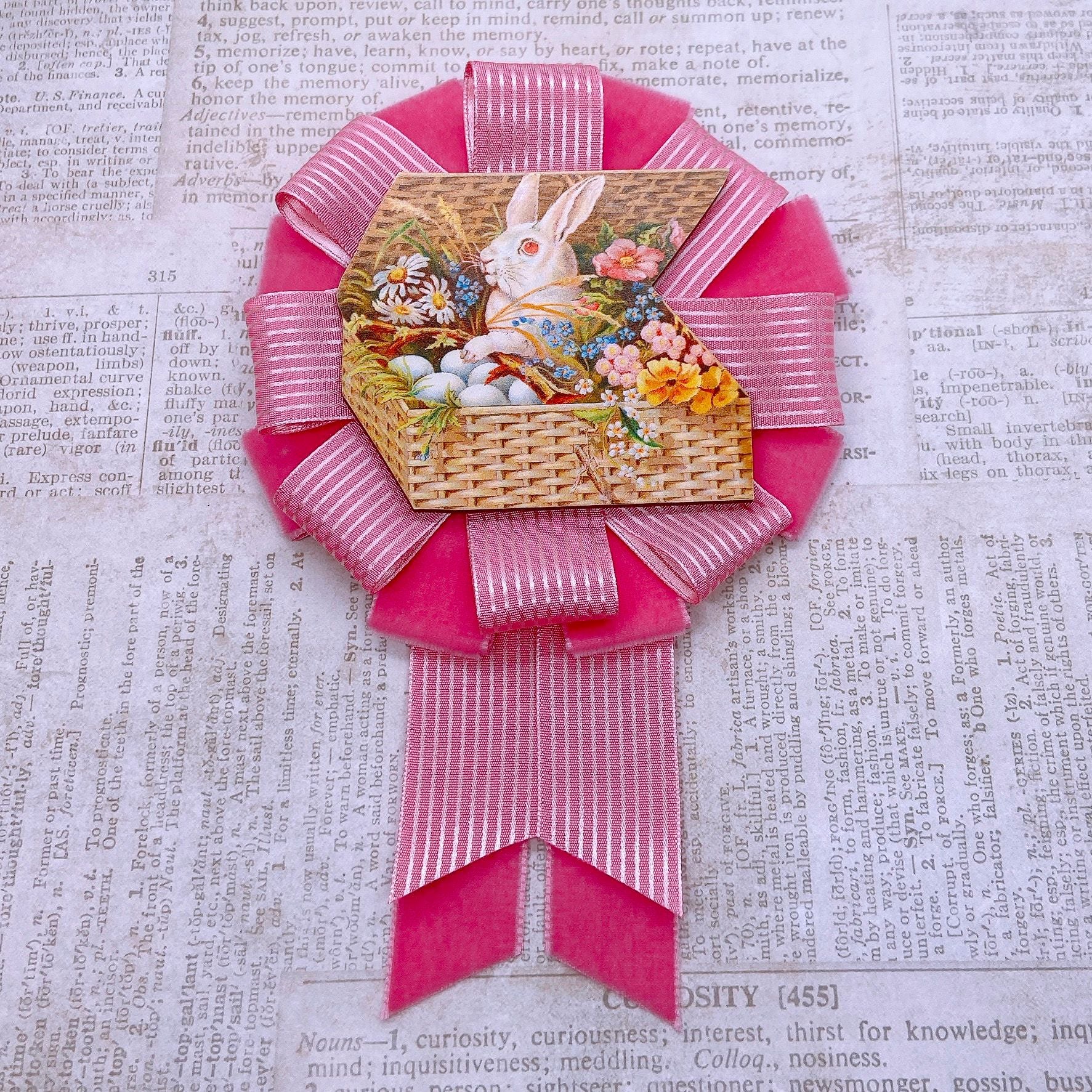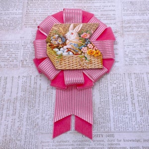 This rosette features a lasercut wooden image of a rabbit in a basket of flowers, surrounded by tiers of pink ribbons. The rosette measures approximately 4.75 inches wide and 7 inches tall.