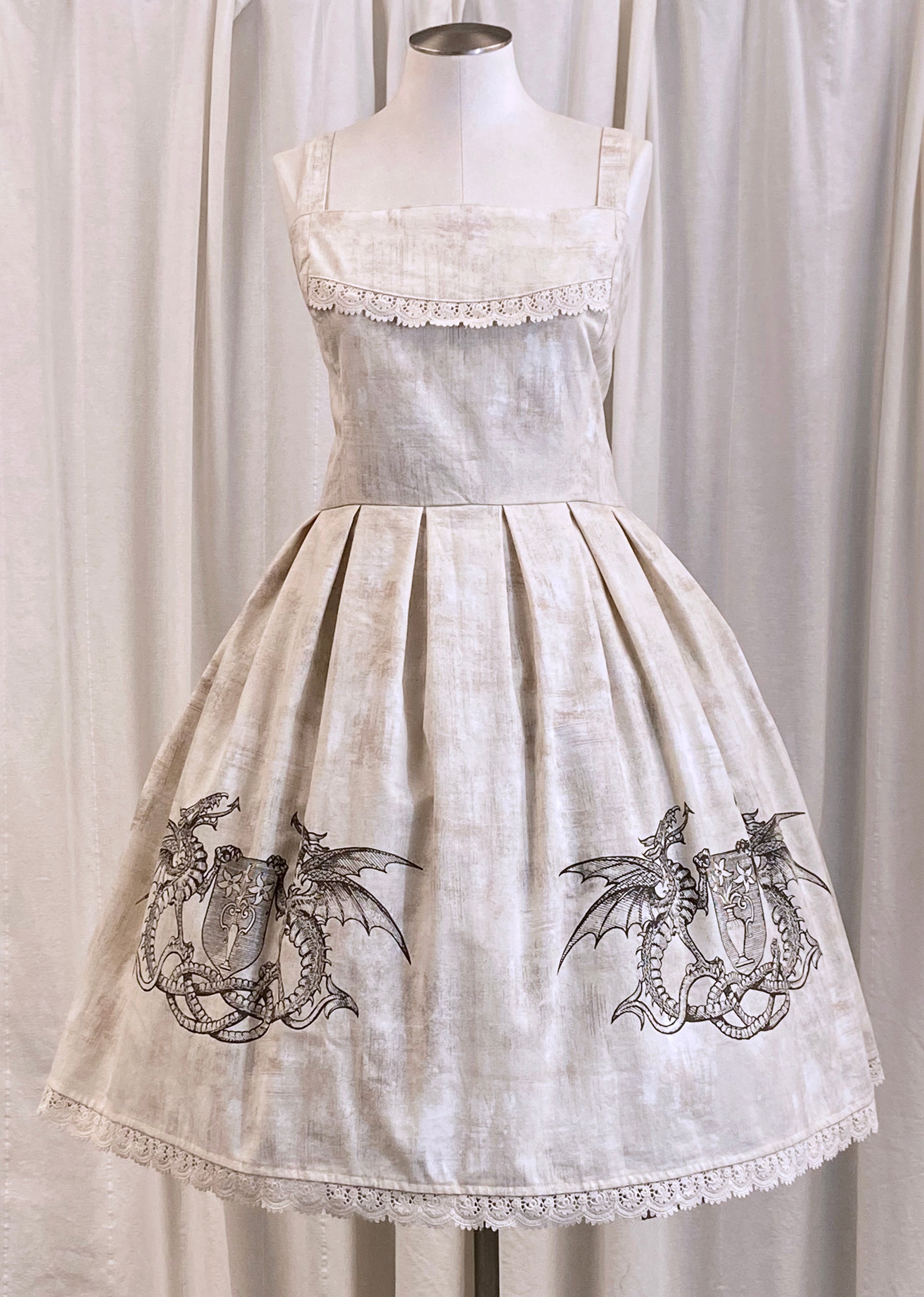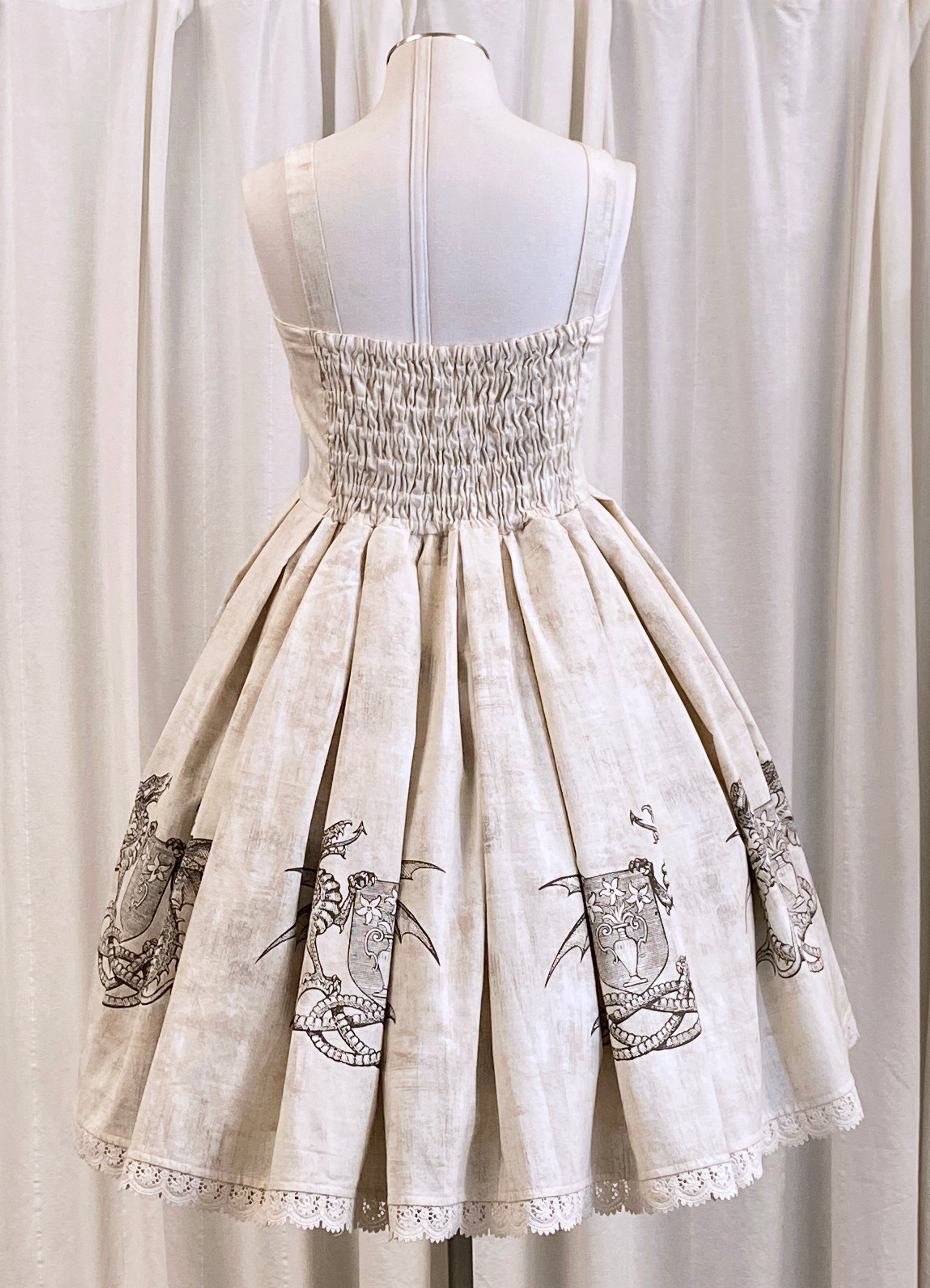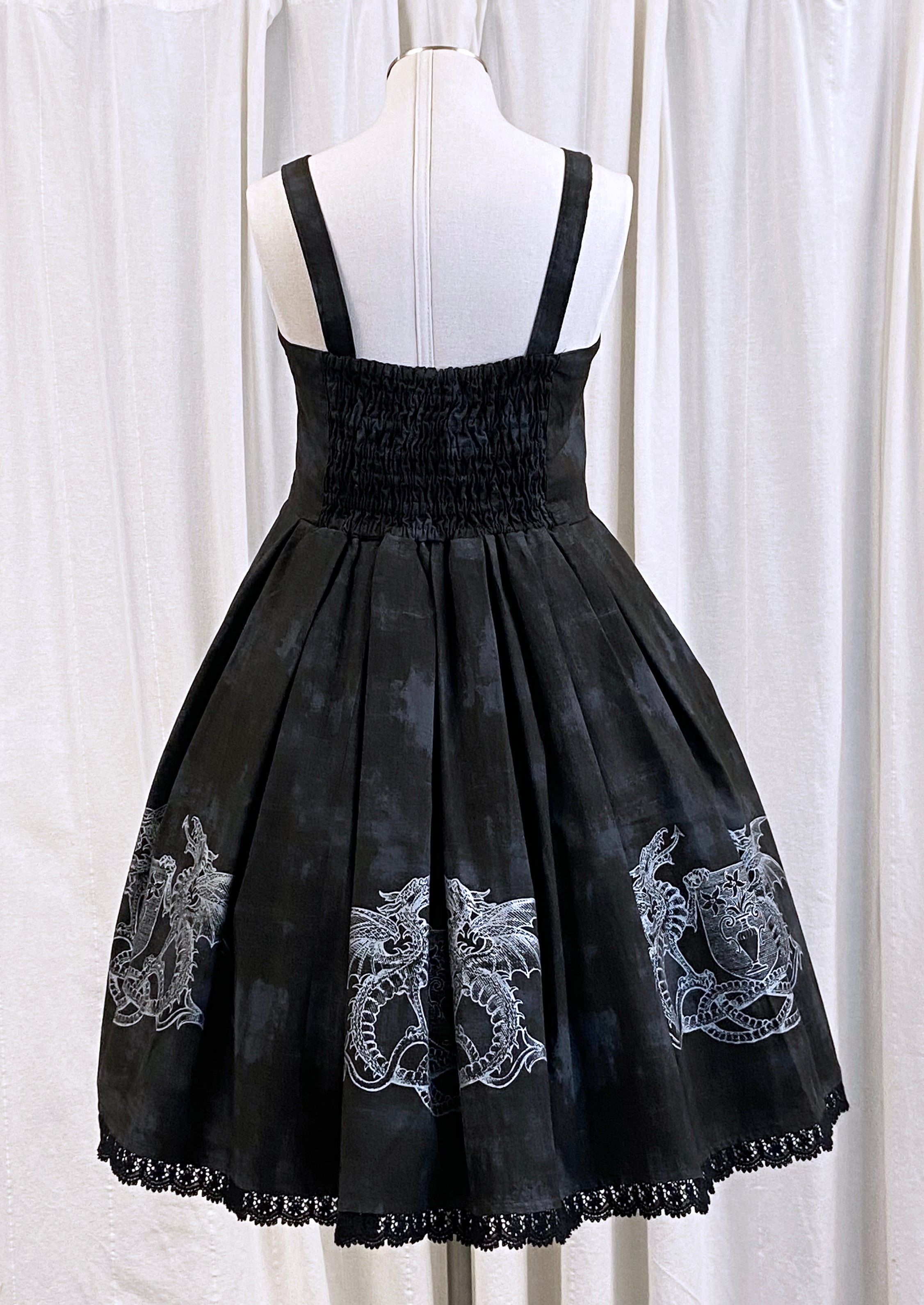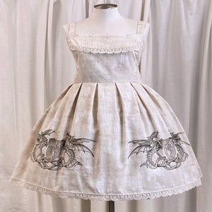 This jumperskirt features a screenprinted design on 100% cotton fabric in size 12 (bust 36-40 inches, waist 32-36 inches.) in black and in size 20 (bust 44-48 inches, waist 40-44 inches.) in cream.