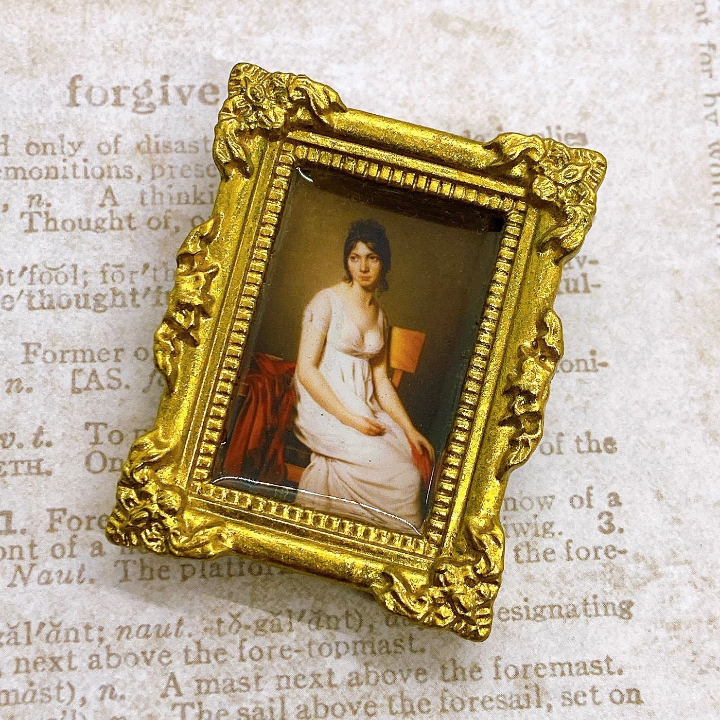 This brooch features a hand painted resin frame with an image from the 1798 Portrait of a Young Woman in White by an unknown artist, possibly Jacques-Louis David. The image has been glazed with clear resin for a glassy finish.