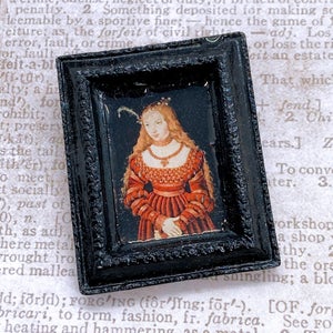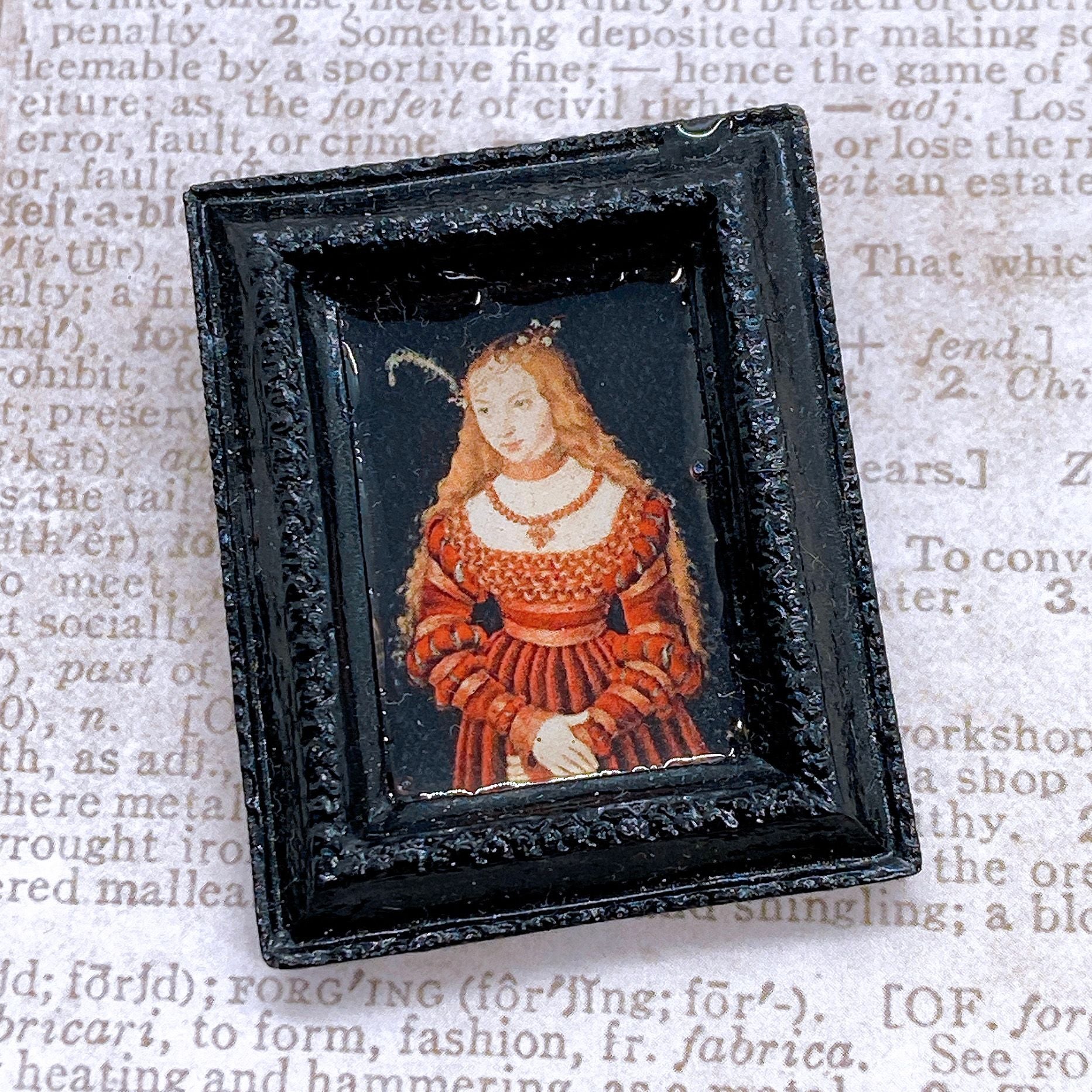 This brooch features a hand painted resin frame with an image from a portrait of Sibylle of Cleves by Lucas Cranach the Elder. The image has been glazed with clear resin for a glassy finish.
