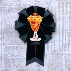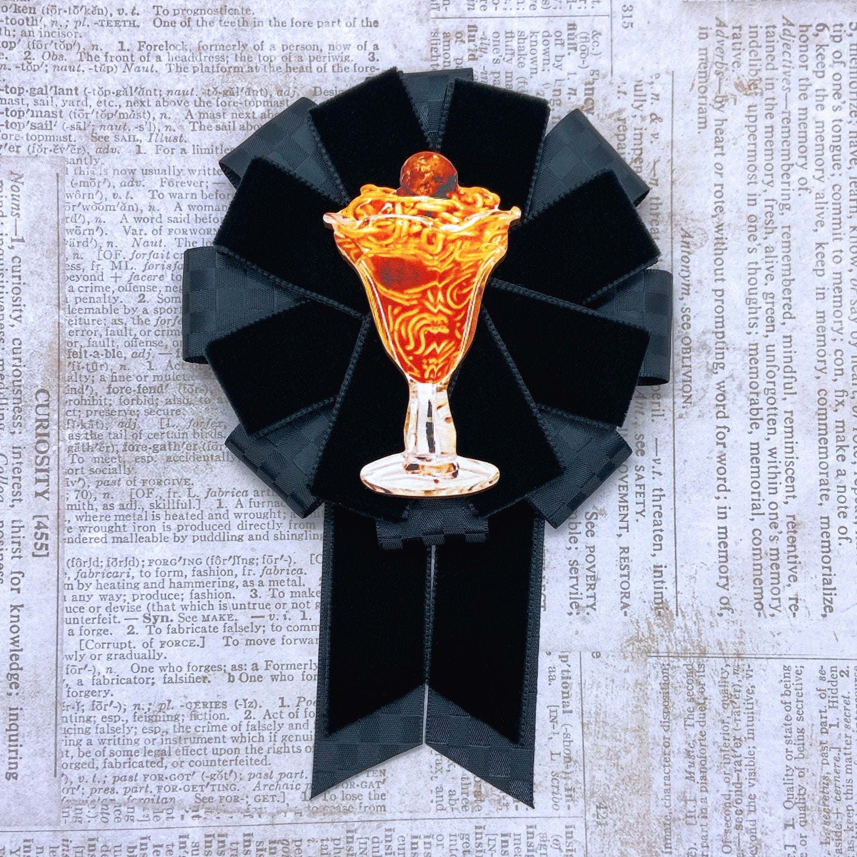 This rosette features a lasercut wooden image of a parfait glass that has spaghetti and meatballs in it for some reason, surrounded by tiers of black ribbons.. The rosette measures approximately 4.5 inches wide and 6.75 inches tall.