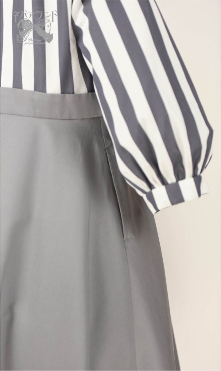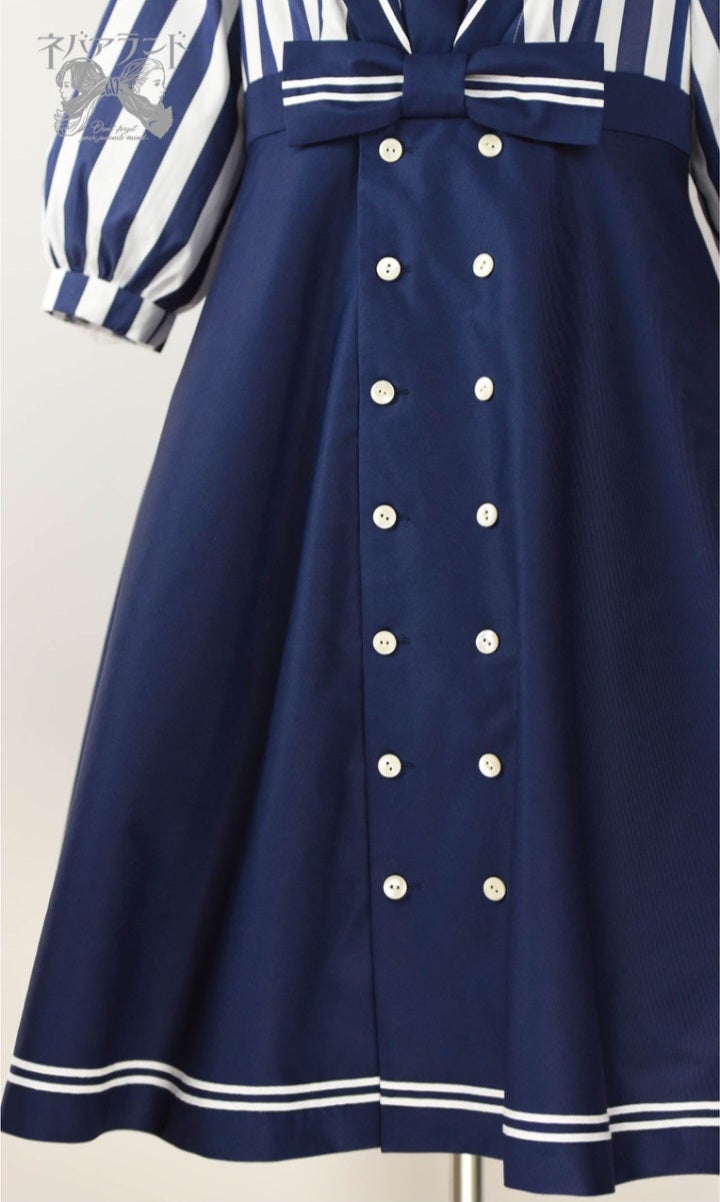やや深めのセーラーカラーと、ハイウエストから広がるフレアシルエットが、王道のマリンスタイル!
