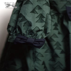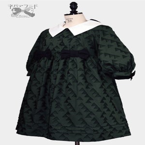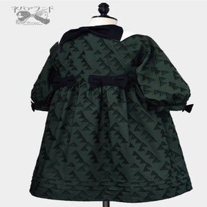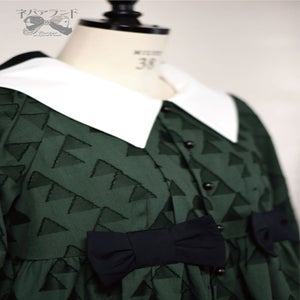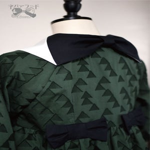深い緑に真っ白な衿、黒いリボンが映える知的な雰囲気の1枚。