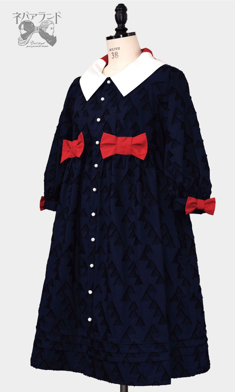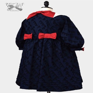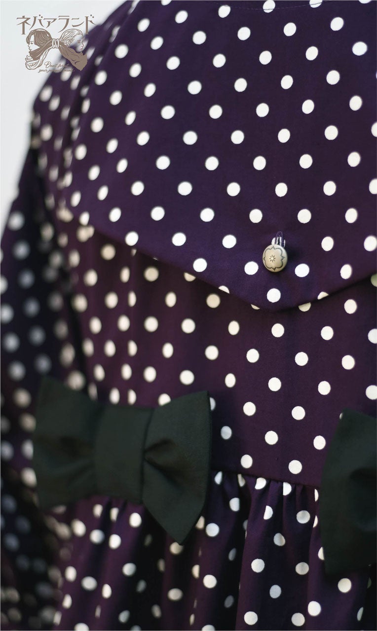 リボンをちりばめて、水玉のコットンで仕立てたAライン。