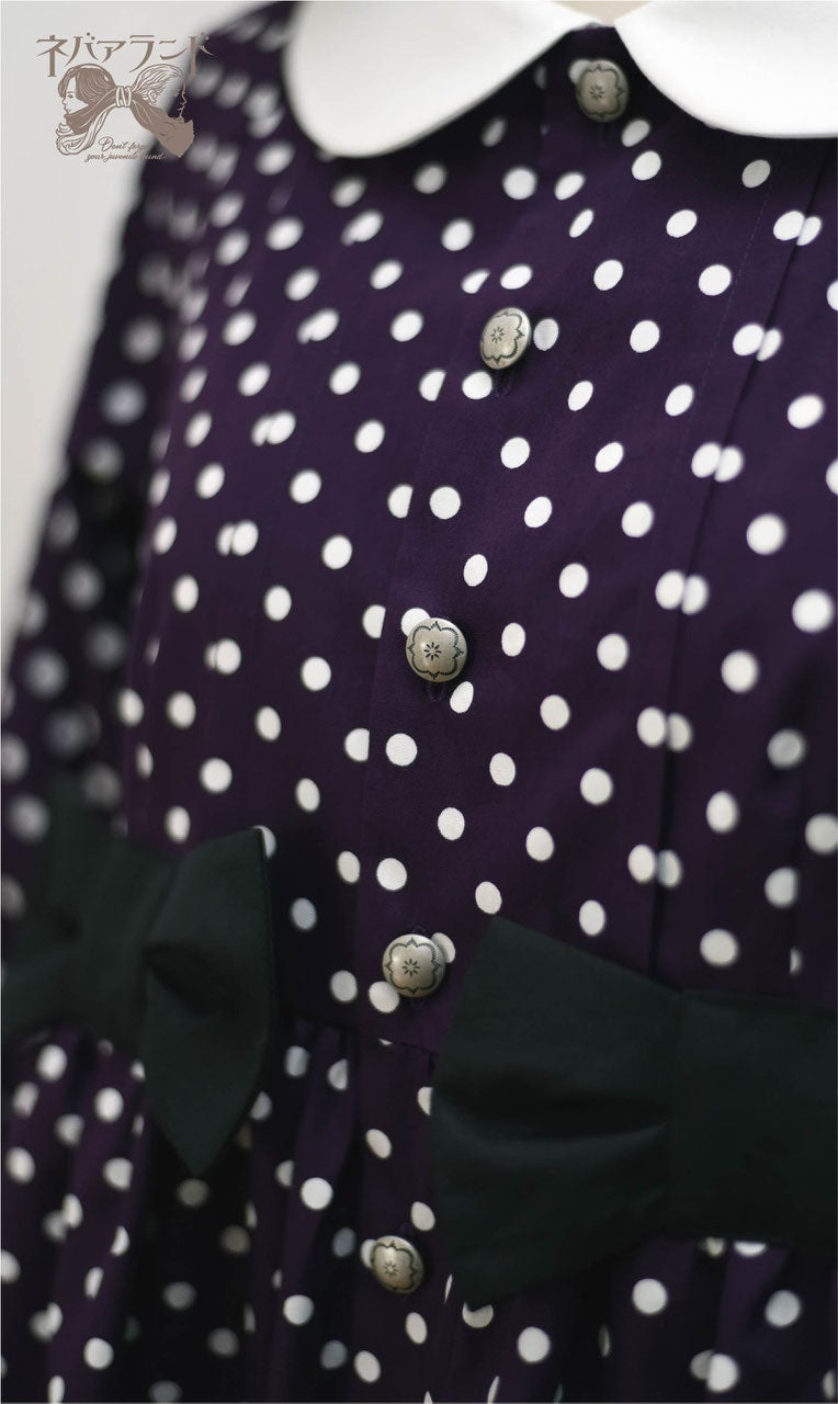 This A-line one-piece is made of polka-dotted cotton fabric adorned with ribbons.