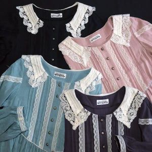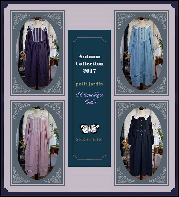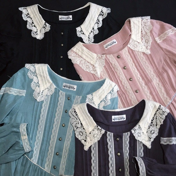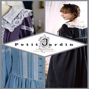 A long-sleeved version of the Petit Jardin dress that was very popular in the summer. The key feature is the collar, which is made with antique lace. This is the first style that we were able to produce thanks to the antique shop Petit Musee, who helped us find the same type of lace.