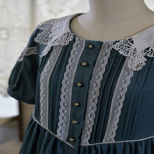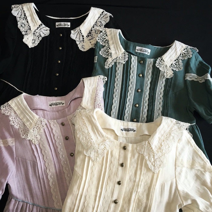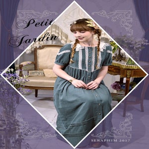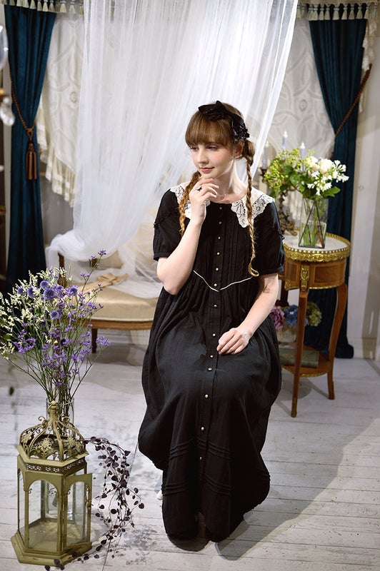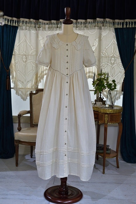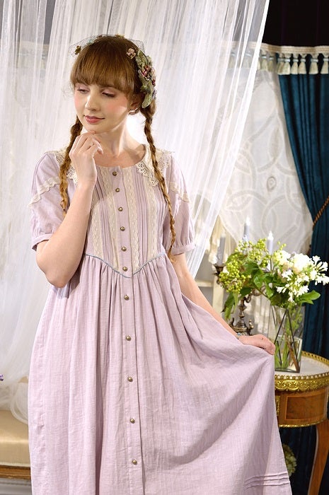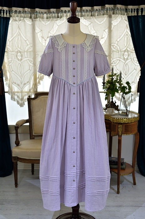 [Brand comment] A maxi-length skirt with a high, downward-sloping front and a soft, flared look. It reminds me of something a Kate Greenaway girl would wear. The material is gauze, perfect for summer. The soft, gentle texture is just like being wrapped in cotton... The chest area is decorated with lace and pin tucks, while the collar is made of luxurious antique linen lace. Hand-knitted antique lace has a delicacy, texture, and the atmosphere of the era and the depth that has been passed down through time, giving it a charm and atmosphere that is difficult to reproduce in modern times. The diagonal line and piping that switch from the back to the front are impressive. The lavender has light blue piping, and the puff sleeves have pin tucks and lace.