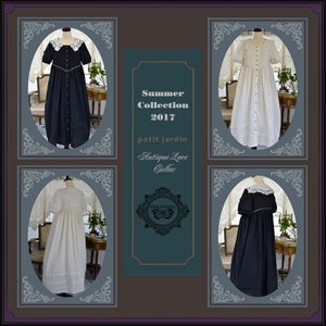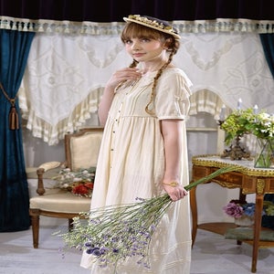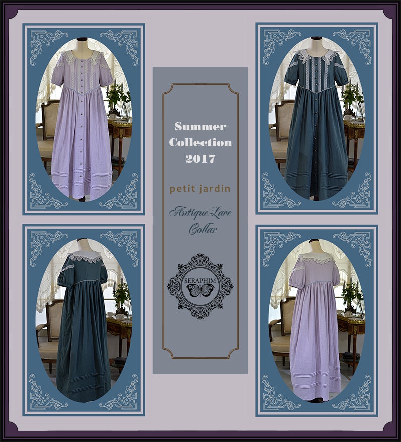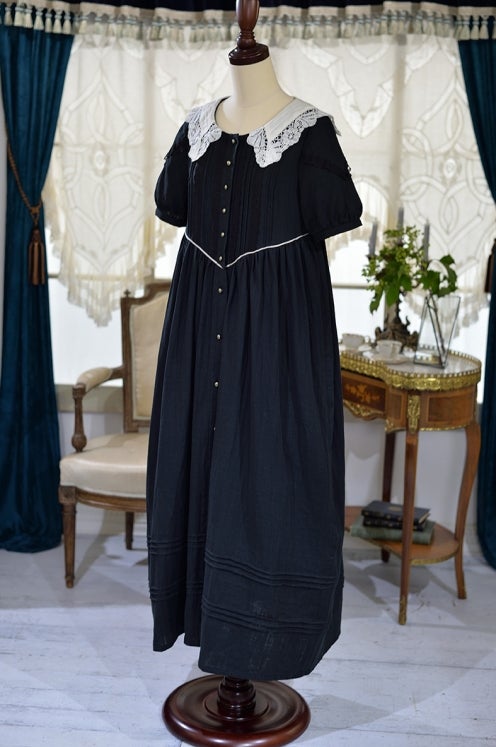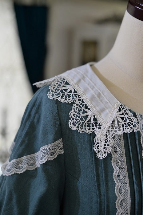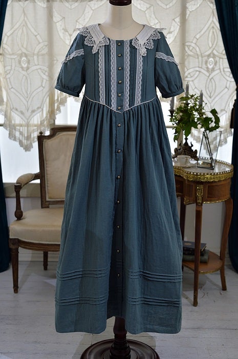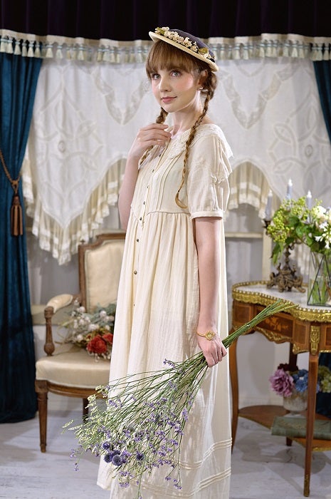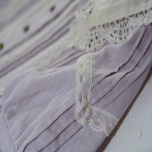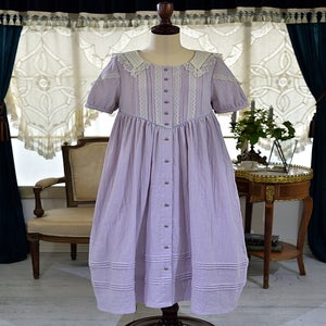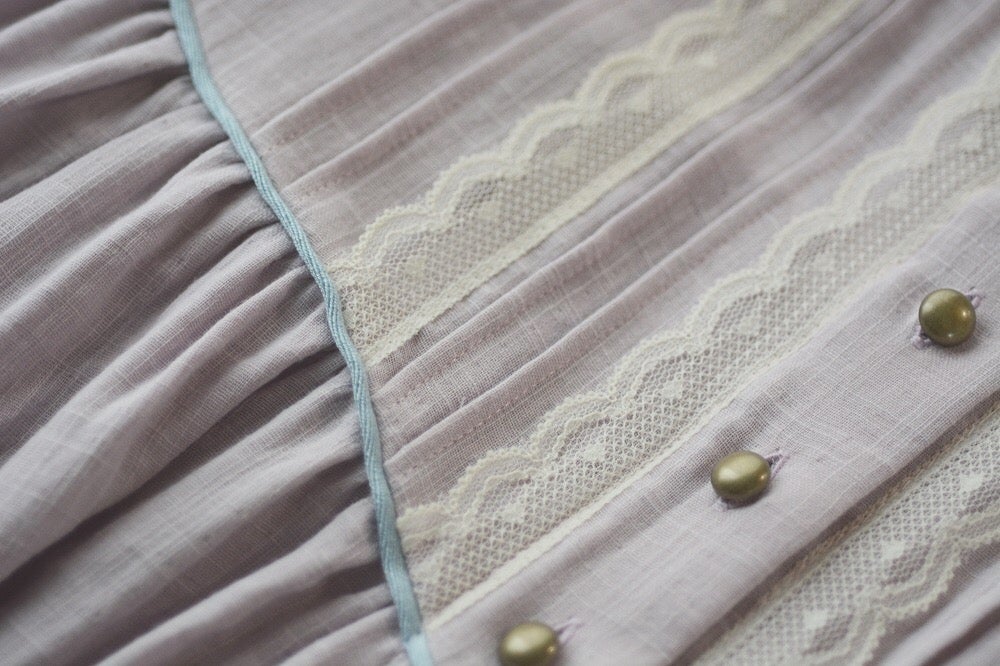 高めの位置から前下がりに切り替えたラインとふんわり広がるマキシ丈のスカート。どこかケイト・グリーナウェイの女の子が纏っているような雰囲気。素材は夏にぴったりなガーゼ。ふんわりと優しい肌触りは、まさにわたに包まれるような心地よさ・・・ 胸元はレースとピンタック、襟はリネン素材のアンティークレースを贅沢に使用しました。手編みによるアンティークレースは繊細さや質感、その時代の空気と時を経てきた深みに現代ではなかなか出せない魅力、雰囲気をまとっています。後ろから前に向かって斜めに切り替えたラインとパイピングが印象的。ラベンダーには水色のパイピングを。パフスリーブの袖にもピンタックとレースをほどこしました。