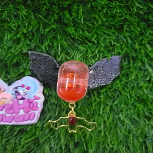 This darling and dark hair clip captures the allure of what hides in the dark. A liquid filled capsule wears a pair of glittery black bat wings, while a single red drop and golden bat dangle from the bottom.