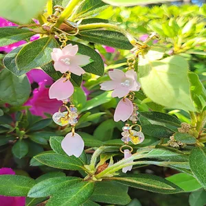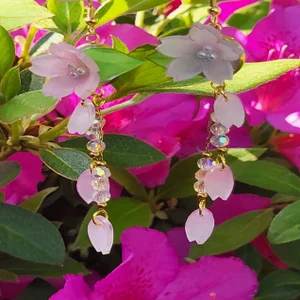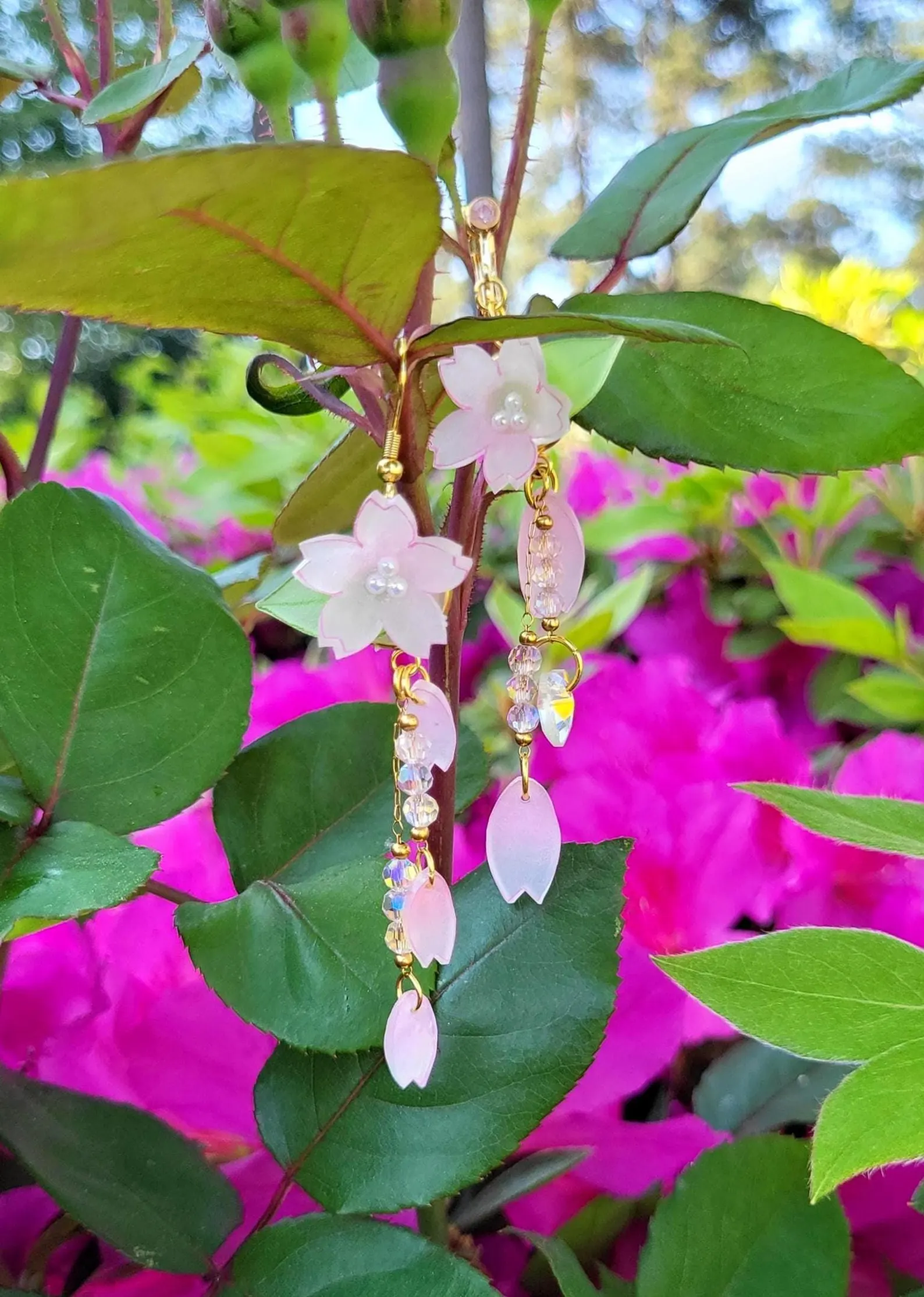"A single cherry blossom flower sits on a leaf with a gold base as beads and petals dangle in a gravity defying dance like the unrivaled sakura snow of the cherry blossom season.