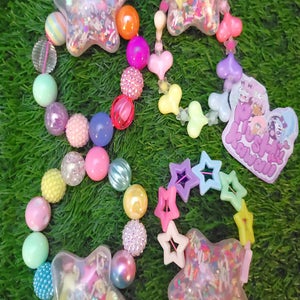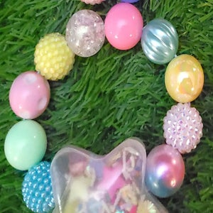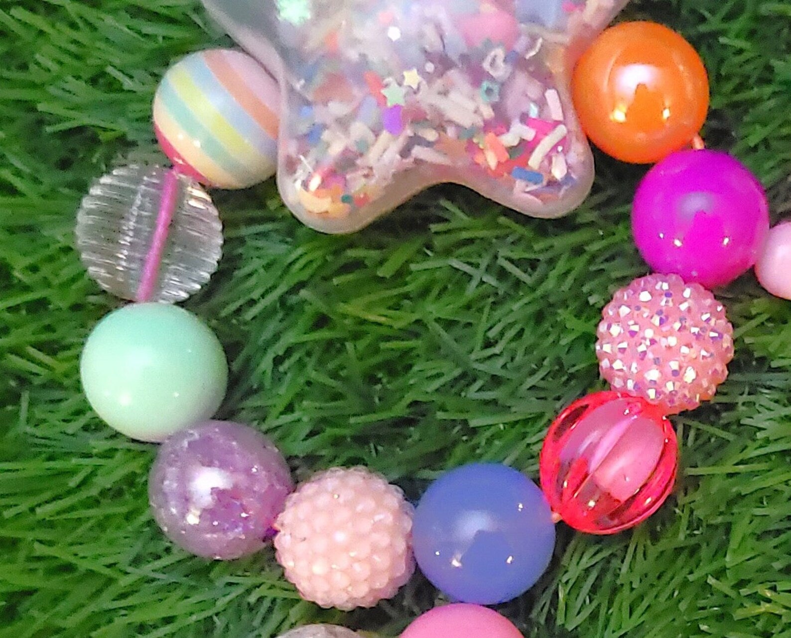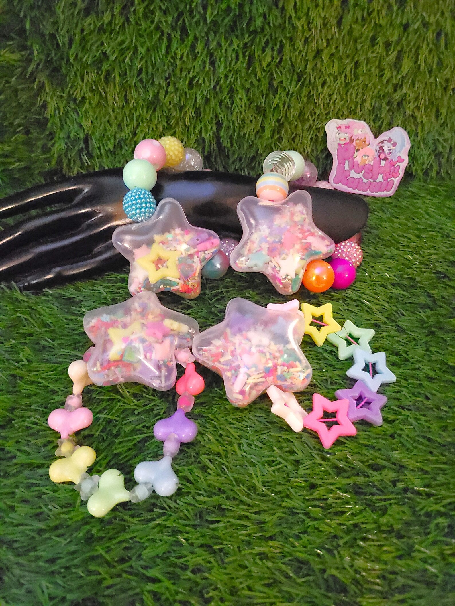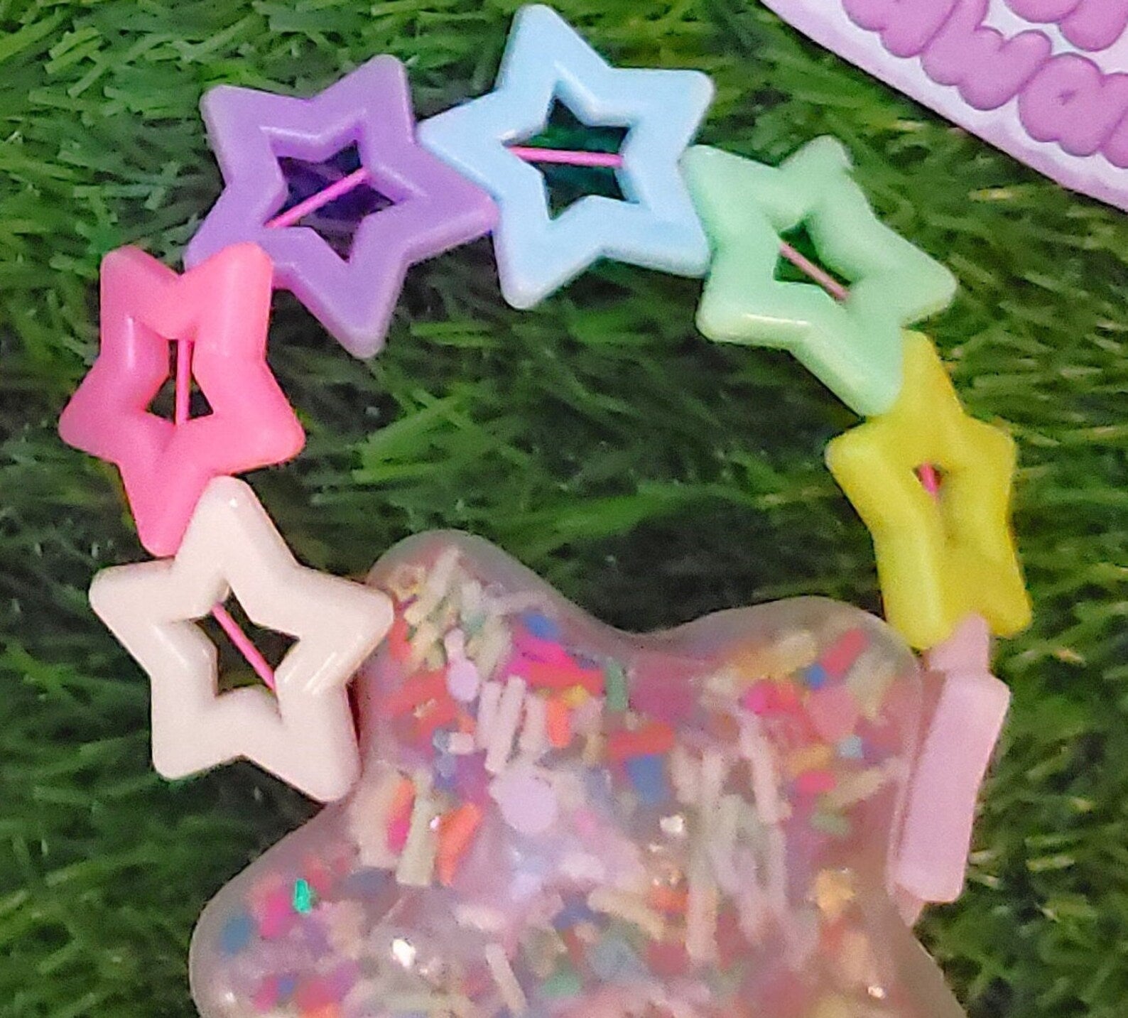 "Our puffy star shaker clip is now available as a bracelet! The same clear puffy star filled with sprinkles, charms, beads, and glitter! Now on a stretchy beaded bracelet.