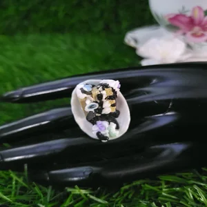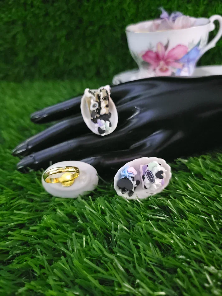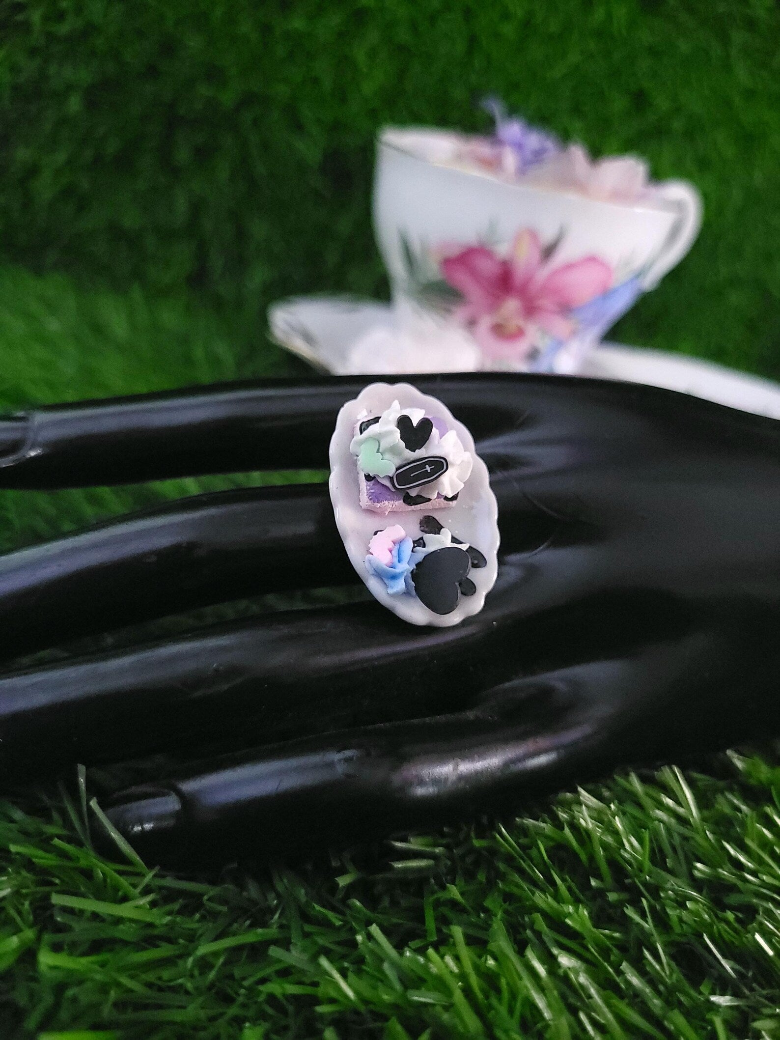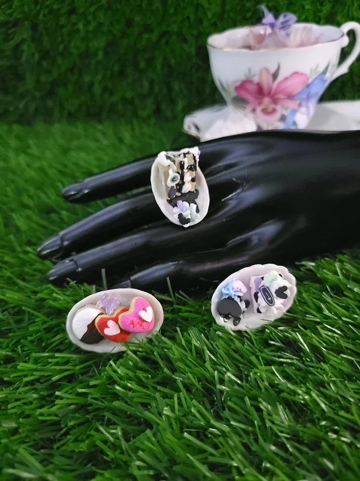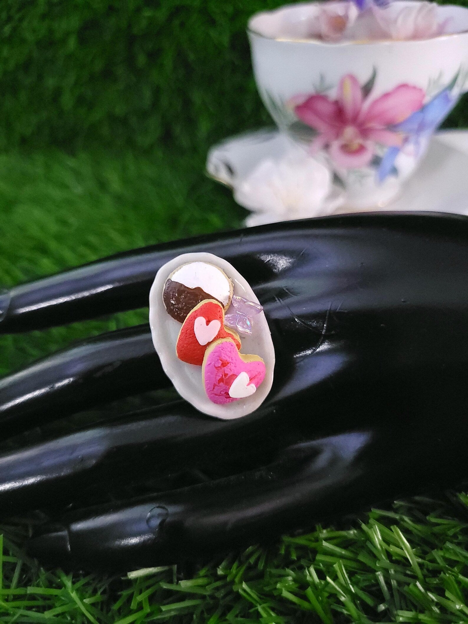 Each cake is made and decorated by hand before being plated and then attached to an adjustable gold tone ring base, making each ring a one of a kind piece."