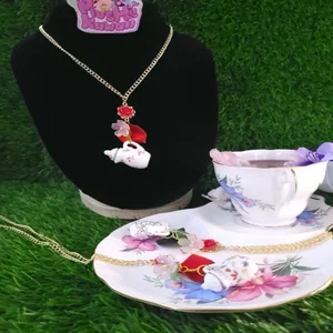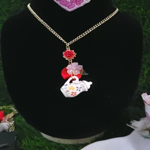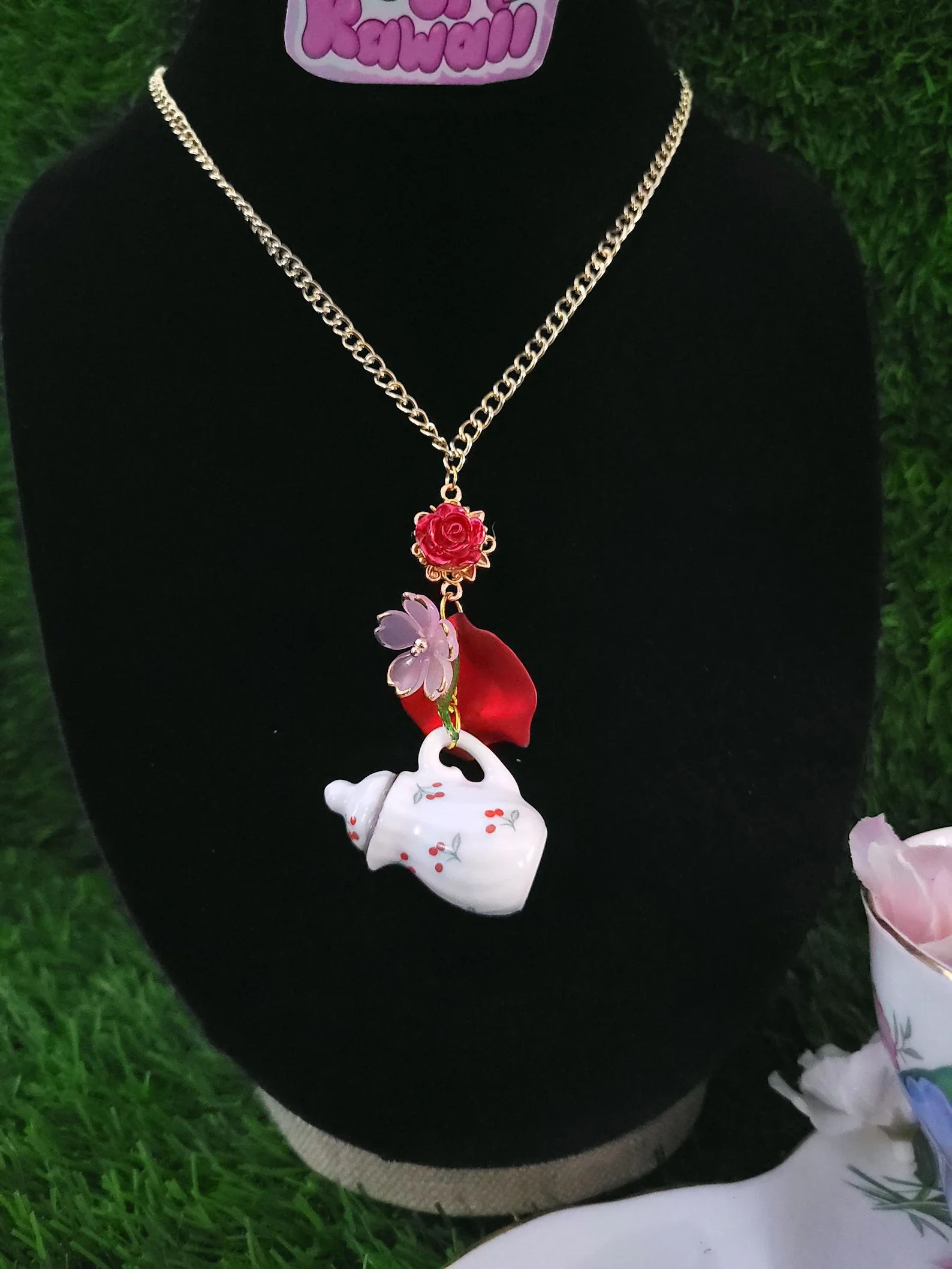 "A simple, elegant necklace featuring a miniature teapot dangling from a rose cameo, backed by a velvety soft rose petal bead and decorated with a gold trimmed sakura flower bead. It is finished with a gold tone chain that closes with a jumbo lobster clasp.